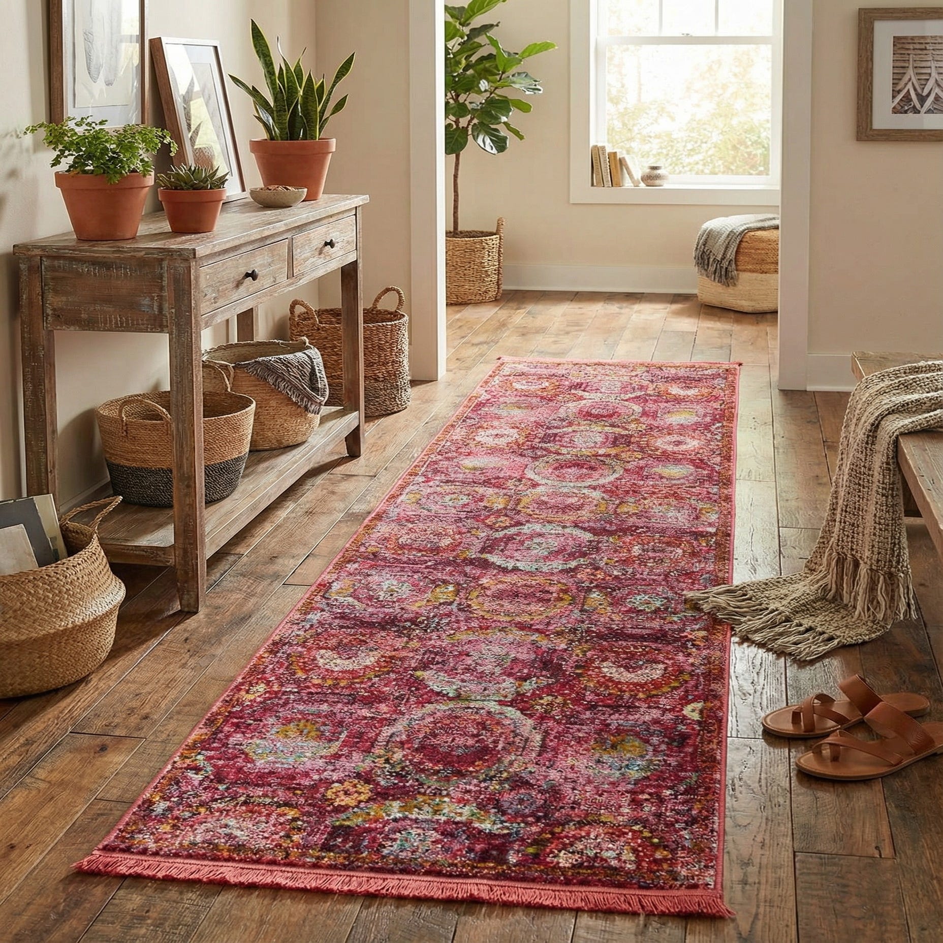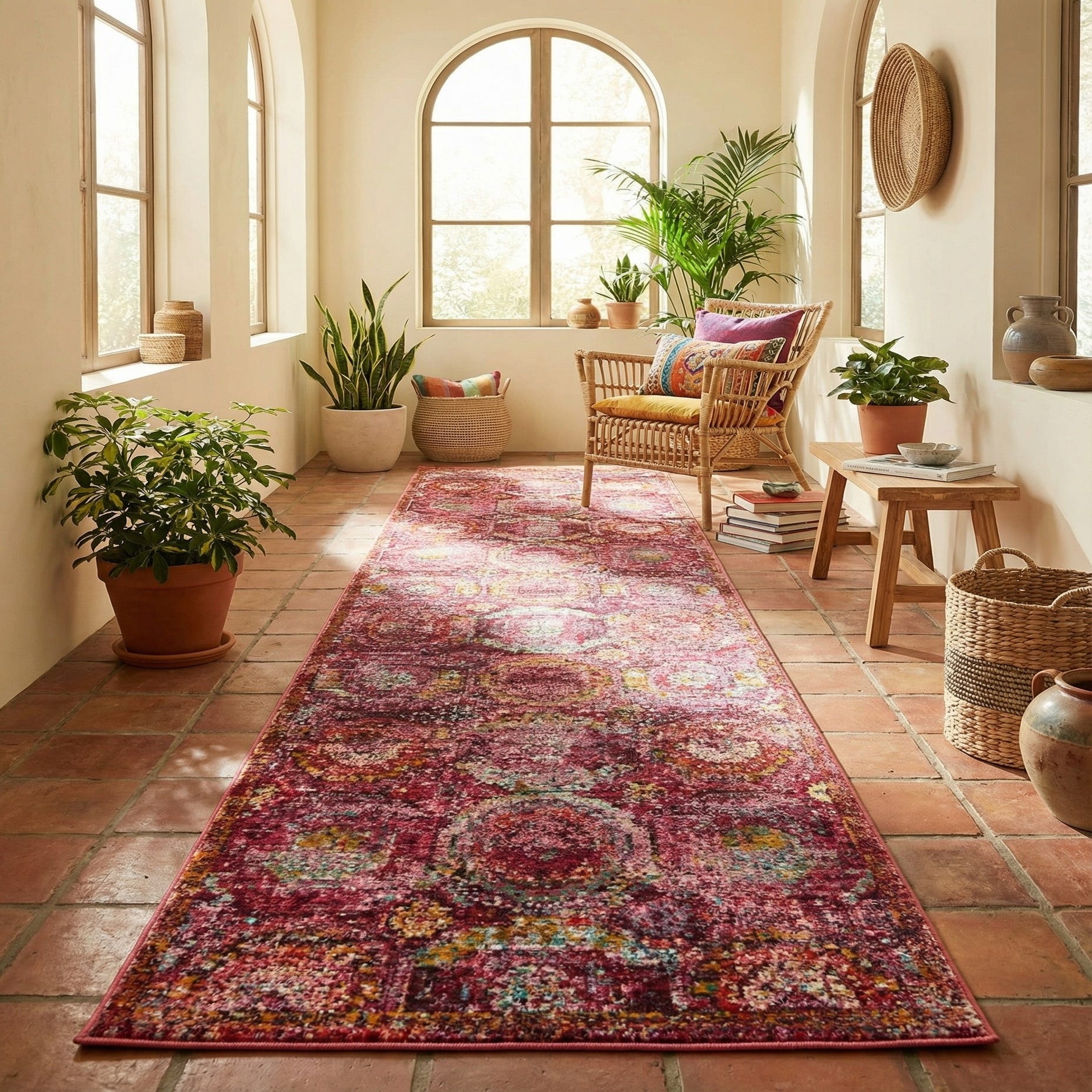 This runner works well in a long entryway or narrow hallway to introduce color and pattern without overwhelming the space. It pairs naturally with warm wood floors and brass or matte black accents, and complements eclectic or bohemian interiors when layered with textured cushions and mixed fabrics. Use it alongside a bed or in a kitchen corridor to anchor seating or cabinetry while adding a lively, lived-in character to the room.