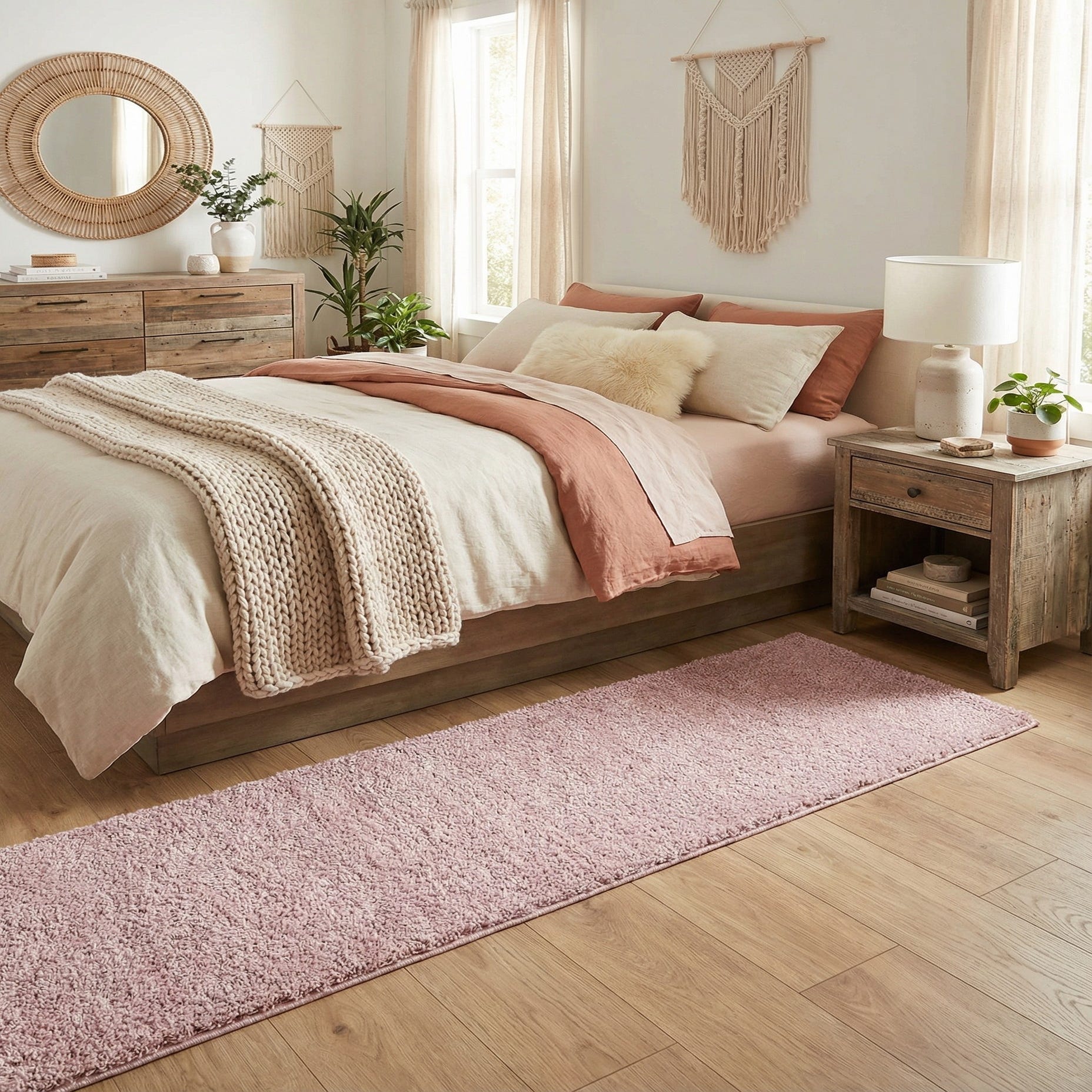 A soft pink 13 ft runner rug with a plush shag pile, perfect for adding warmth to a hallway.