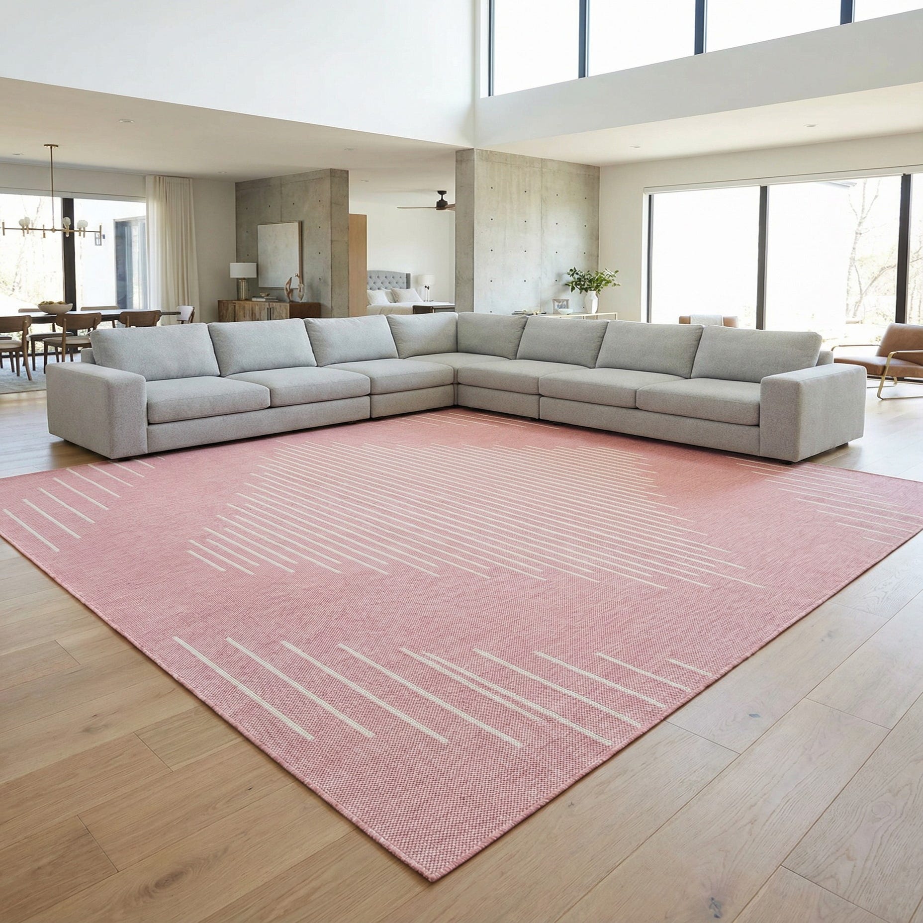The stain-resistant nature of this rug makes it suitable for outdoor settings where spills or weather may be a concern, as well as indoor spaces such as dining rooms or play areas. Its pet-friendly and shed-free qualities ensure it is a practical choice for households with animals. The subtle coloring and minimalist design make it versatile for a variety of décor styles—including contemporary, coastal, or Scandinavian—and its large square format would suit open-plan living spaces or outdoor patios, providing a cohesive anchor for the arrangement of furniture and decoration.