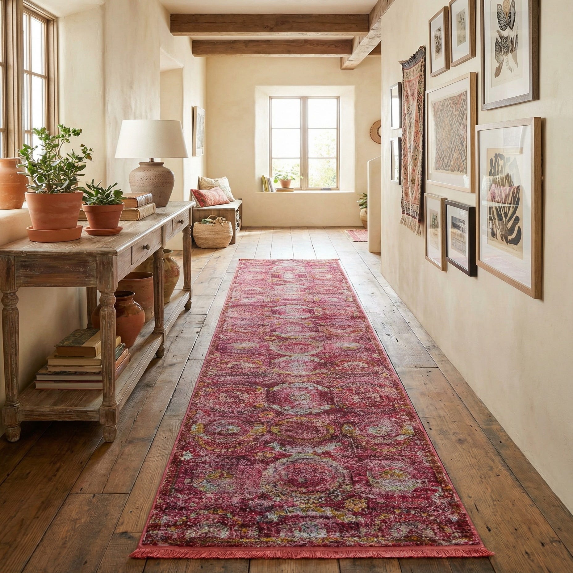 The overall look balances bohemian warmth with transitional structure, making it a versatile choice for hallways, entryways, or narrow kitchen aisles. It pairs confidently with neutral walls and light woods to let the colors pop, or with jewel-toned sofas and patterned throw pillows for a layered, eclectic room. The runner also complements mid-century and vintage furnishings, and works well where you want a bold color statement without heavy texture.