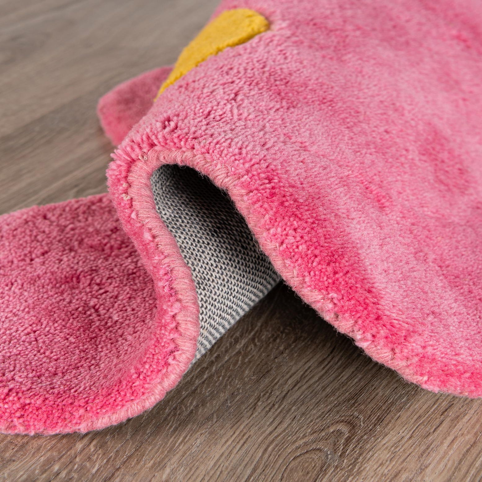 A cheerful flower-shaped rug with a bold pink field and a warm yellow center, this piece has a simple, playful silhouette that adds an immediate pop of color. Hand-tufted from 100% wool, the pile is dense and soft to the touch with a slight springiness underfoot, giving it a cozy, tactile presence. The rounded petals and clean edge create a graphic, modern-retro look that reads as both casual and carefully crafted.