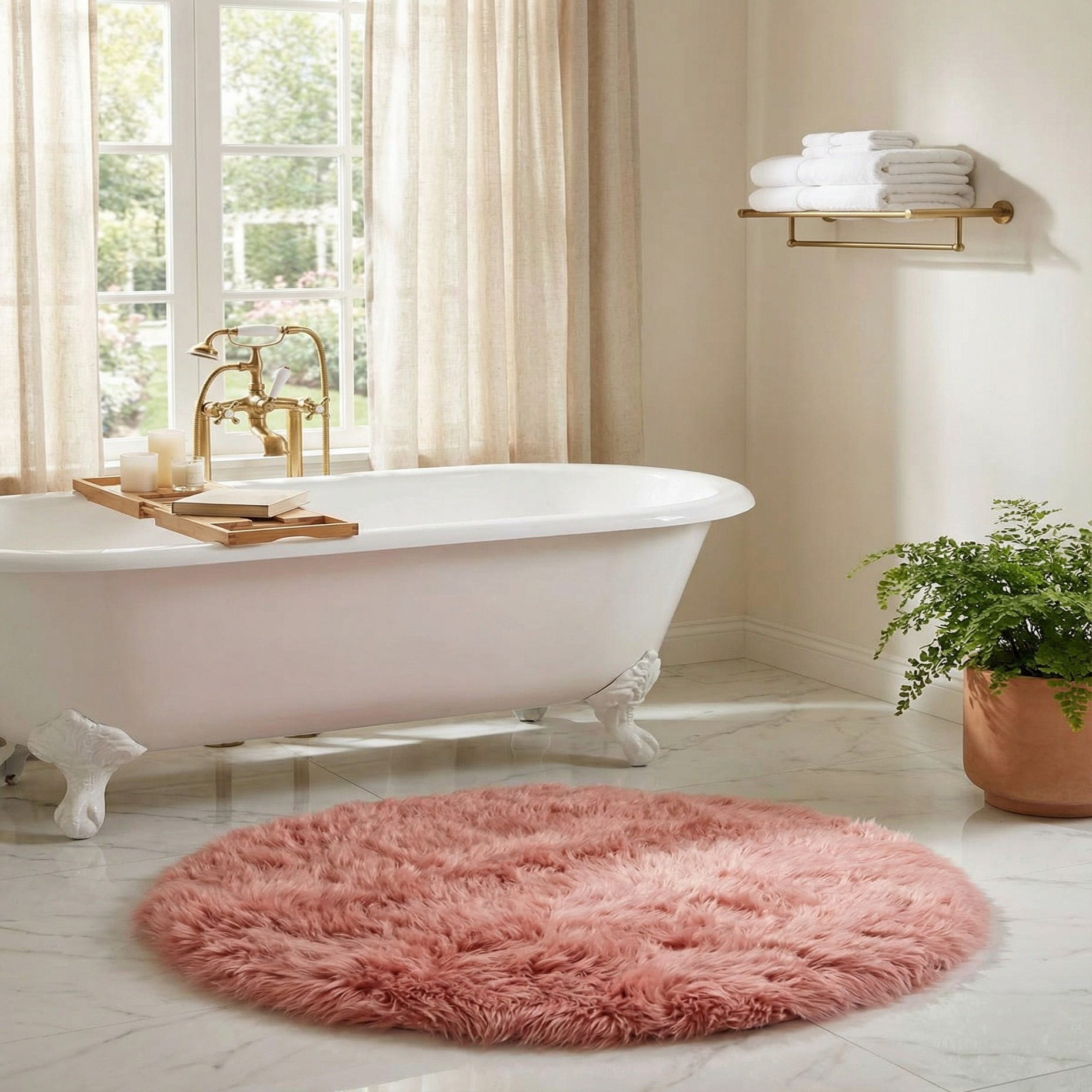 A soft, round 2' 0 x 2' 0 pink lambskin rug with a medium, textured pile, perfect for adding warmth.