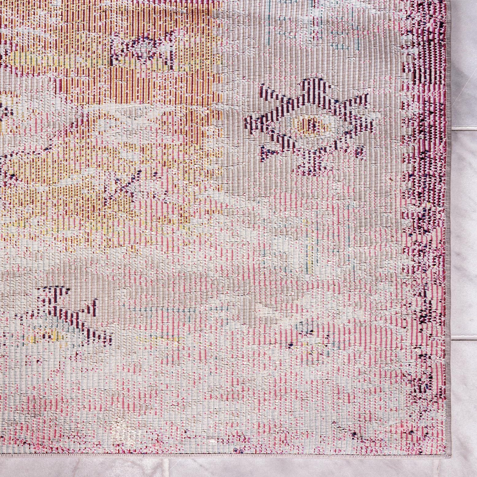 A worn-look medallion design sits on a warm pink ground, with two sunlit gold-orange panels anchoring the center and a scattering of floral and geometric motifs across the field. Beige, blue, green, purple and red accents play through the pattern, creating a layered, vintage-inspired aesthetic that reads lively without feeling busy. The surface is machine made of 100% polypropylene, with a low, dense pile that has a soft touch and a subtle sheen.