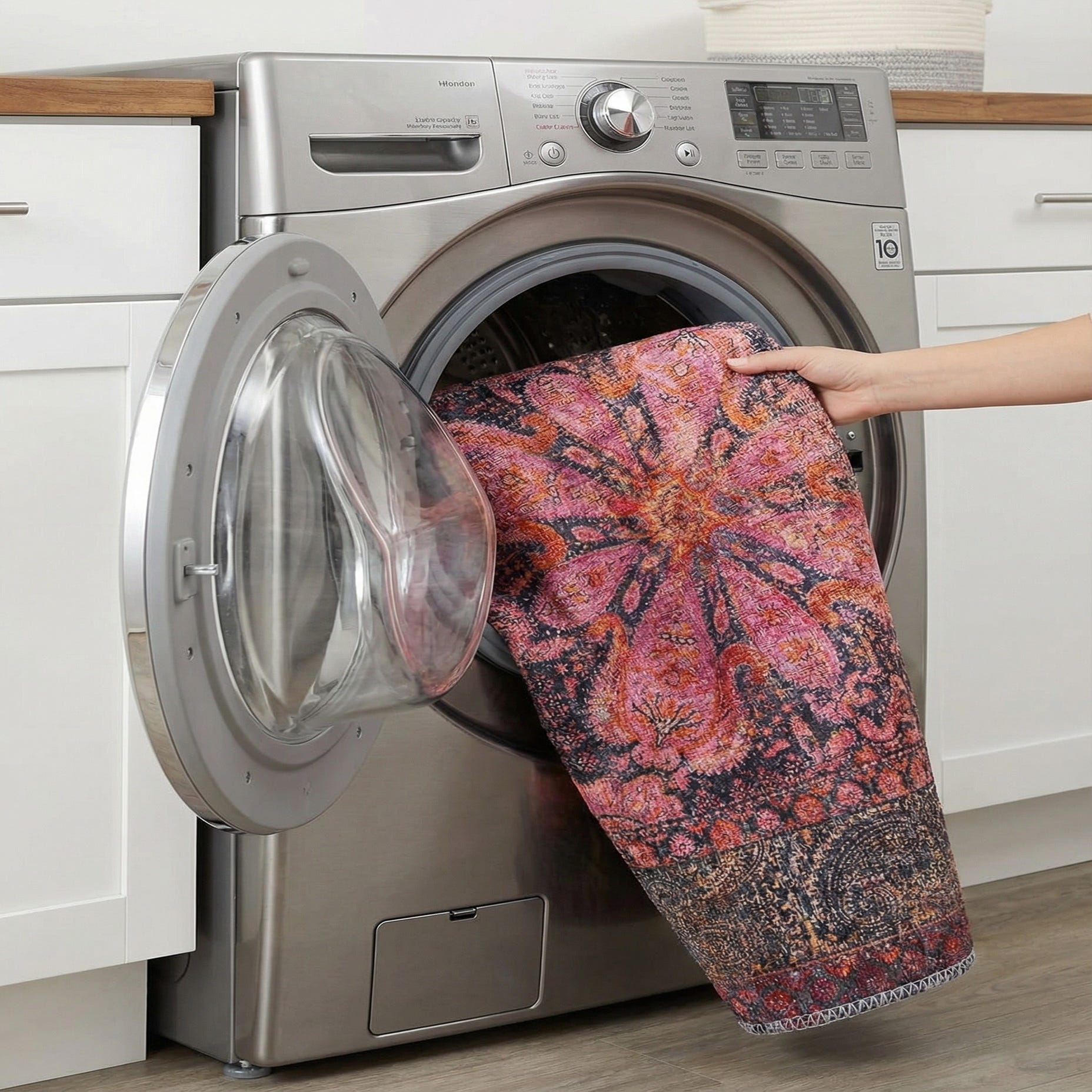 Machine-made chenille gives the rug a soft, velvety hand and a subtle sheen underfoot, so it feels inviting in smaller living spaces. Use it as an accent in a bedroom or nursery, layered over hardwood at the foot of a bed, or placed beneath a compact seating area or console in an entryway. It pairs especially well with warm wood finishes, brass or antique-gold hardware, neutral upholstery, and textured textiles—an easy fit for bohemian, eclectic, modern-glam, or transitional interiors seeking a touch of color and pattern.