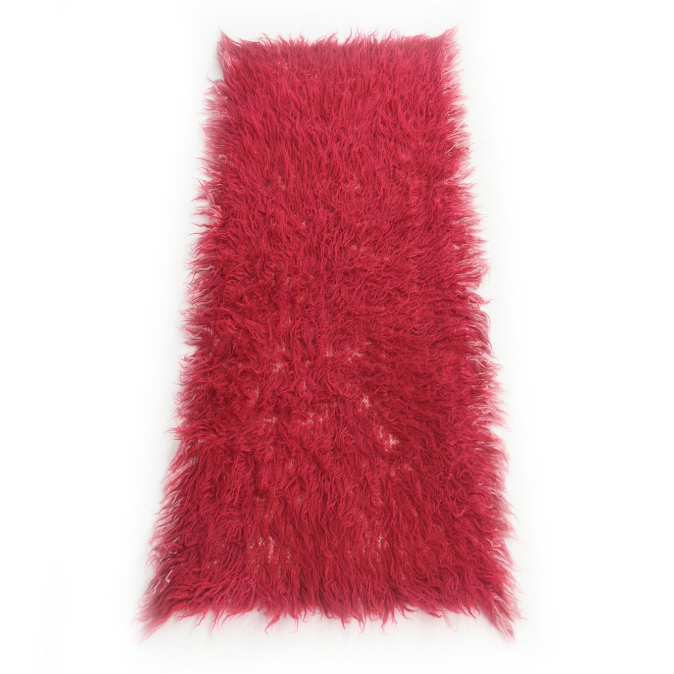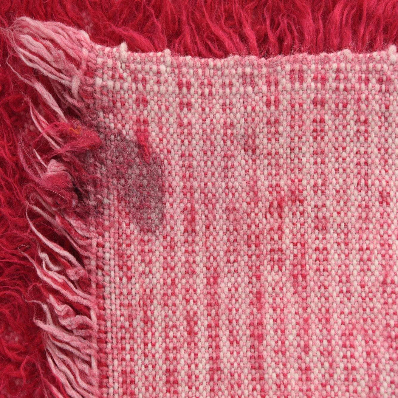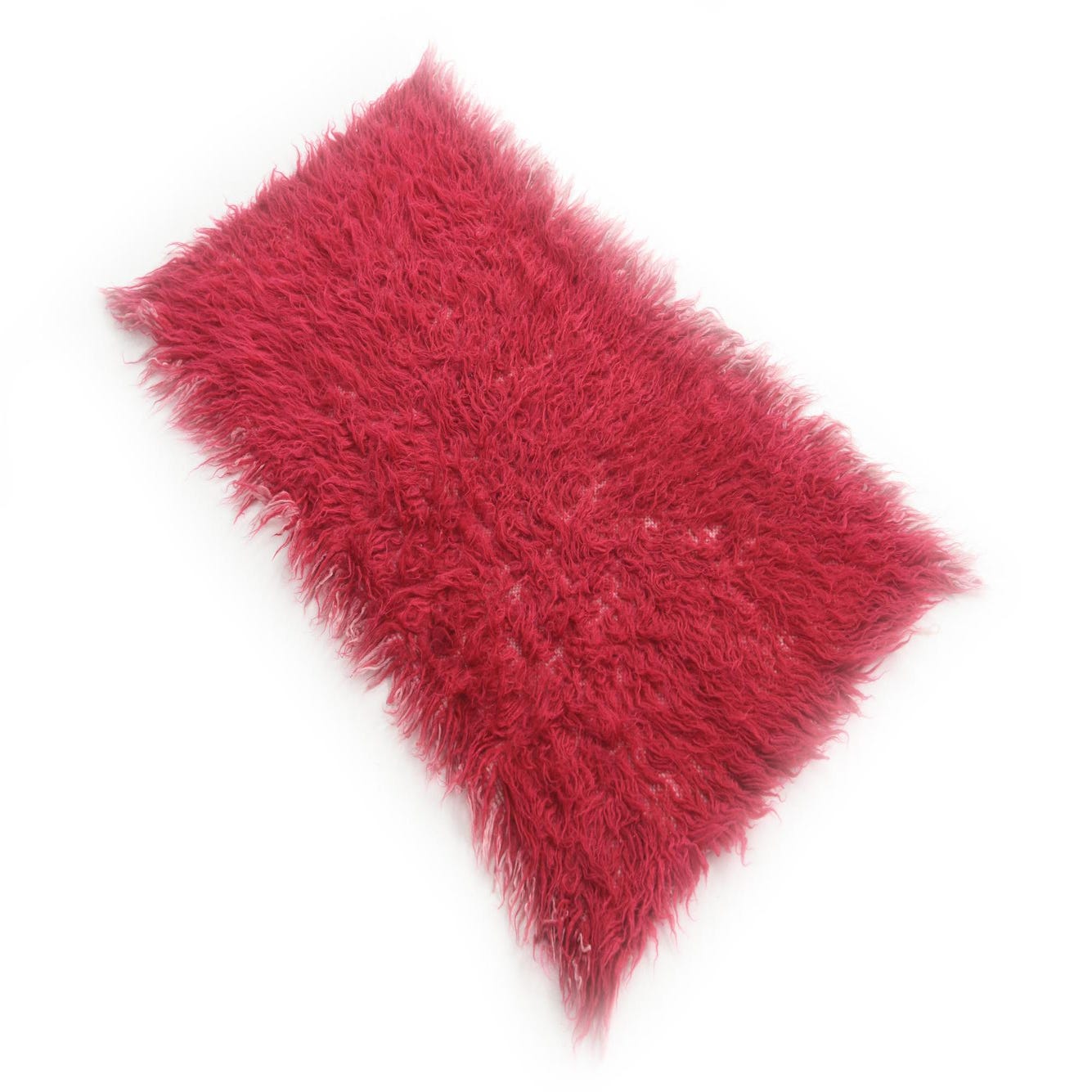 A vibrant 2x3 rectangular shag rug in a deep pink hue, featuring a plush, shaggy texture and visible handmade craftsmanship.