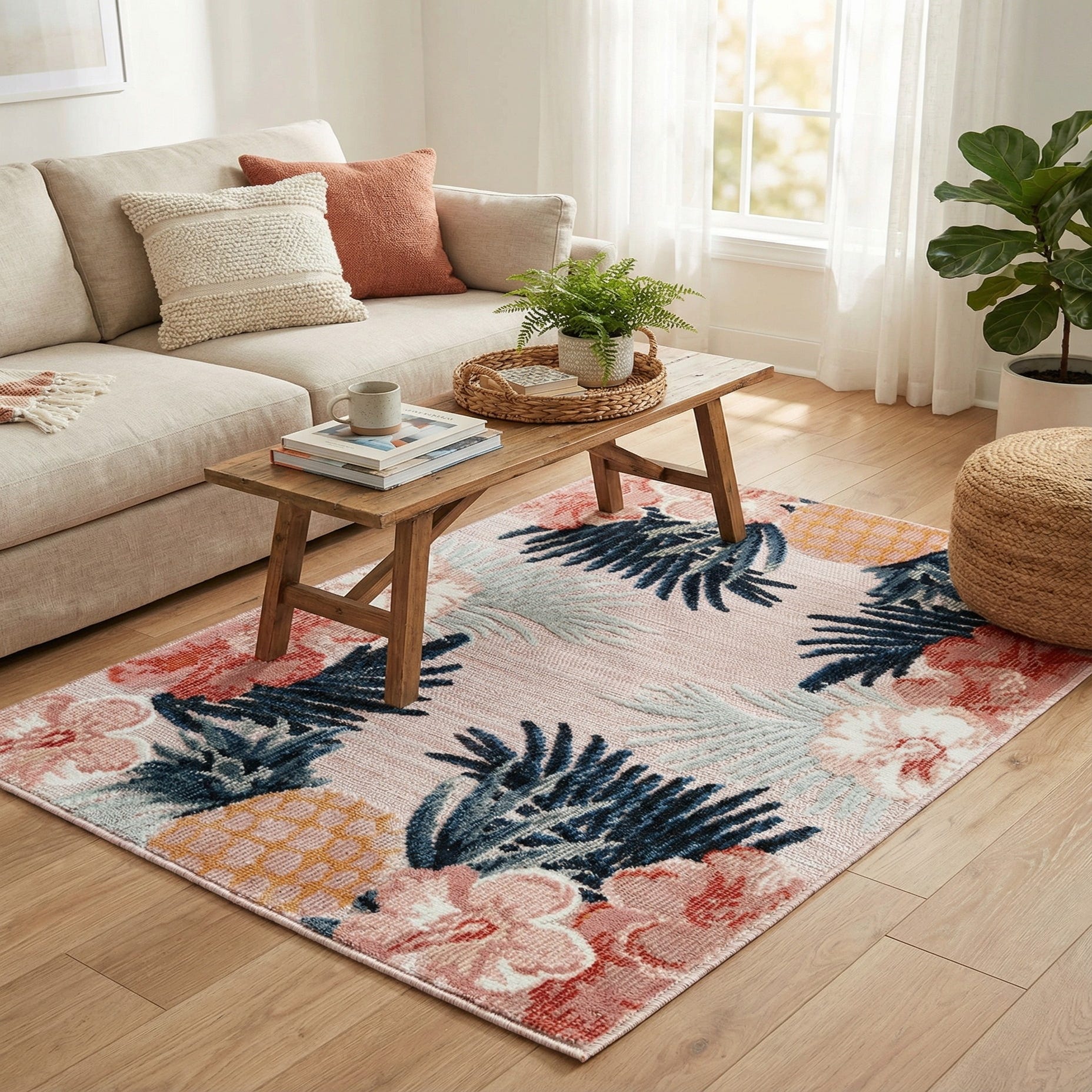 A 2x3 rectangular pink tropical rug with a border of hibiscus flowers, palm fronds, and pineapples, suitable for indoor or outdoor use.
