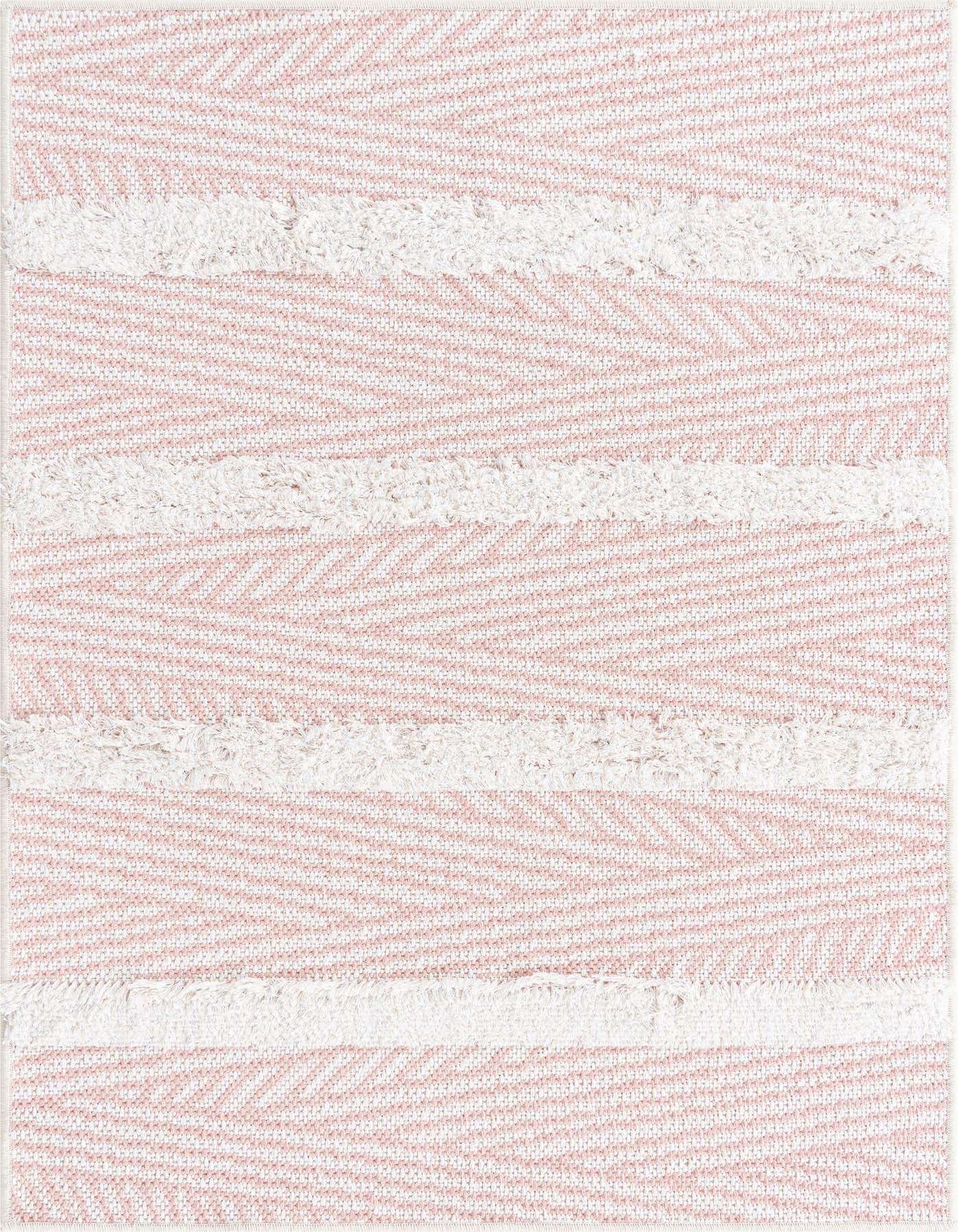 The rug's pattern showcases a series of horizontal lines that create a sense of movement across its surface. These lines are accentuated by textured details, adding depth and interest to the piece. The background color of the rug is a soft, welcoming pink, complemented by natural tones that lend a sense of warmth and subtle contrast.
