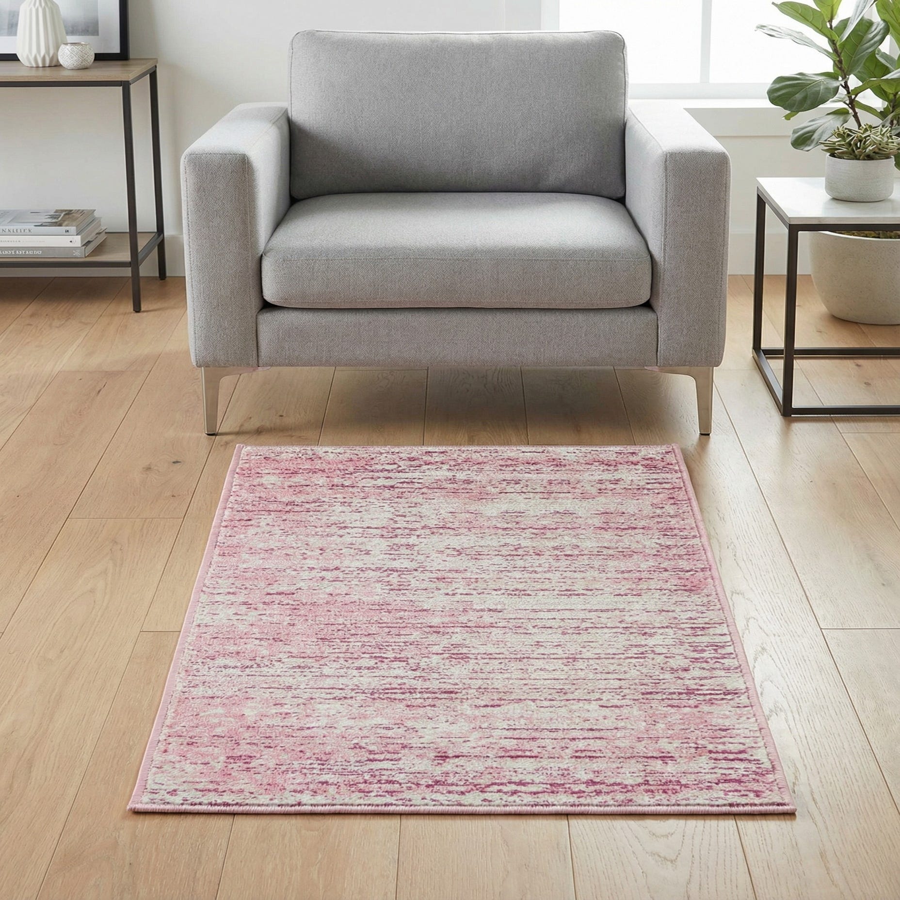 A soft pink field anchors this rug, overlaid with an irregular ivory striation that creates a worn, abstract linear pattern. The subtle contrast between the pink background and ivory highlights gives the surface depth without heavy ornamentation. Machine made from 70% polypropylene and 30% polyester, the rug has a low-profile pile with a smooth, slightly cushioned hand; the polyester fibers add a gentle sheen to the lighter areas while the polypropylene provides durable, easy-to-place structure. Clean, serged edges finish the piece for a tidy, tailored look.