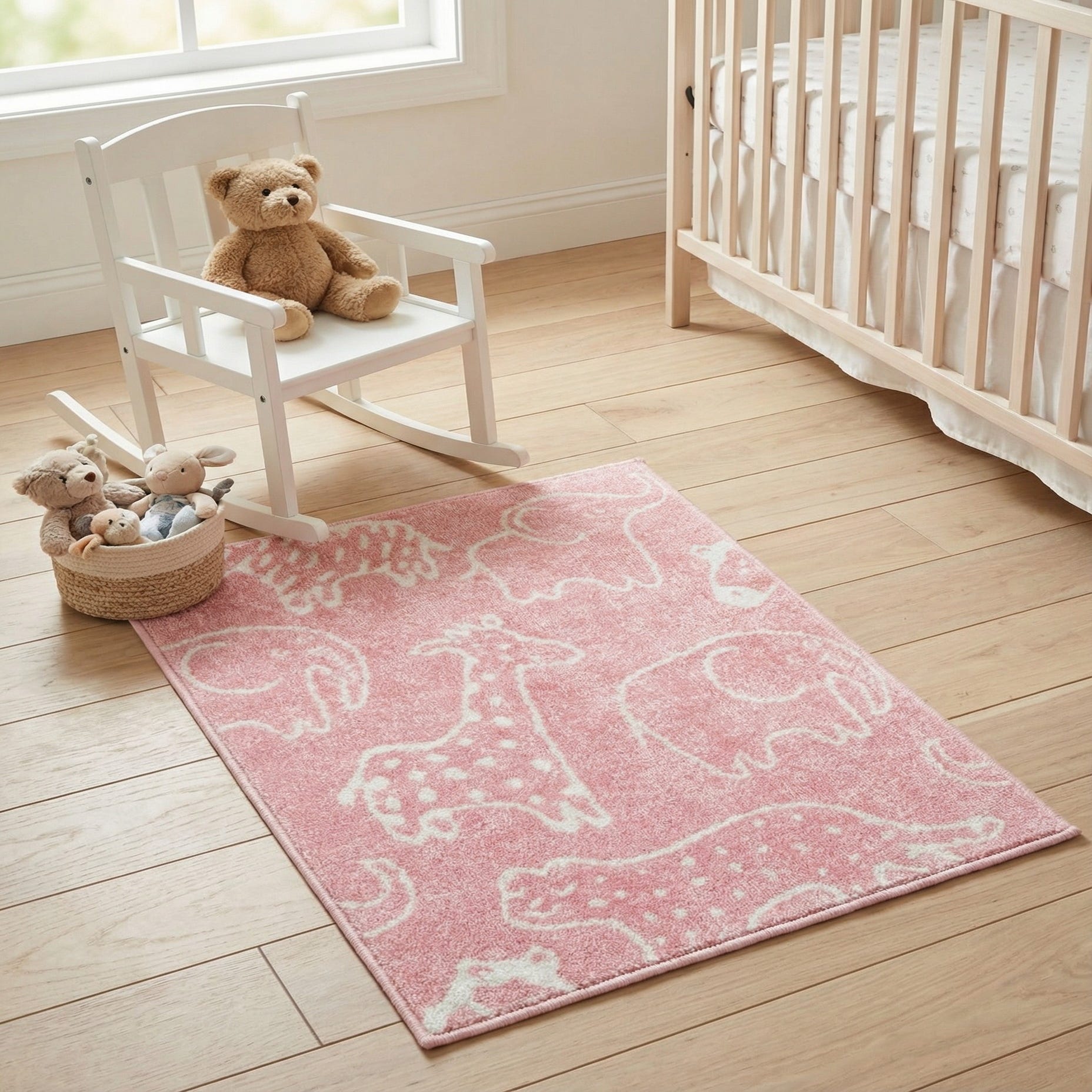 A playful field of ivory animal outlines—giraffes, elephants and a spotted big cat—moves across a warm pink background for a lively, child-focused look. The motifs are simple and friendly, drawn in soft ivory against the solid pink so the pattern reads clearly without feeling busy. Machine-made from 100% polypropylene, the rug has a low-profile, even pile with a gently plush hand that’s soft to touch and sits smoothly underfoot. Neat bound edges give it a finished look that holds its shape in everyday use.
