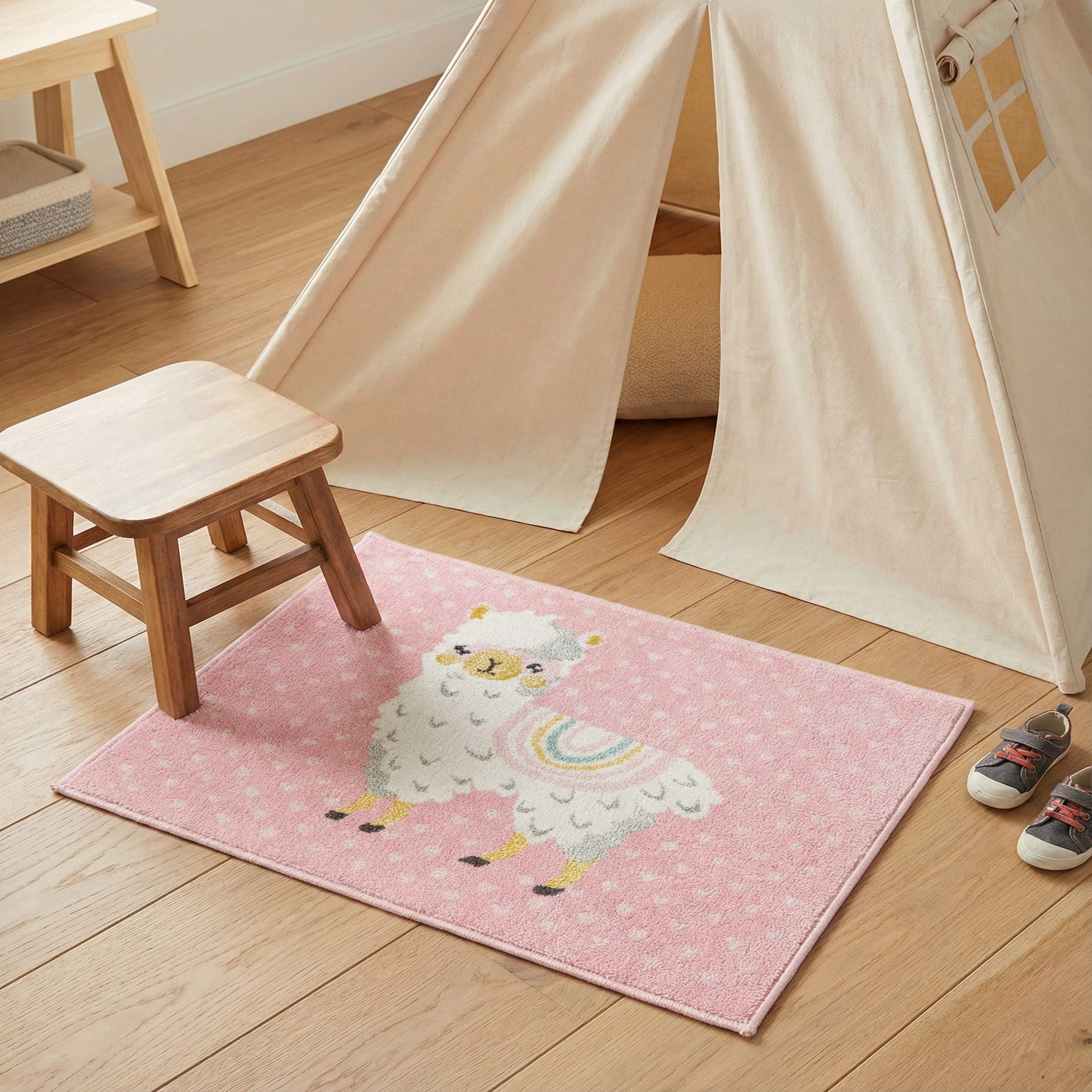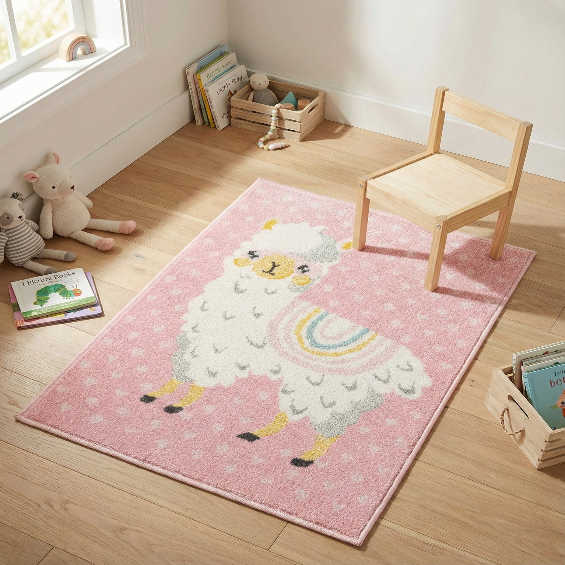 A 2x3 rectangular pink rug featuring a cute white llama with a rainbow blanket, surrounded by small hearts.