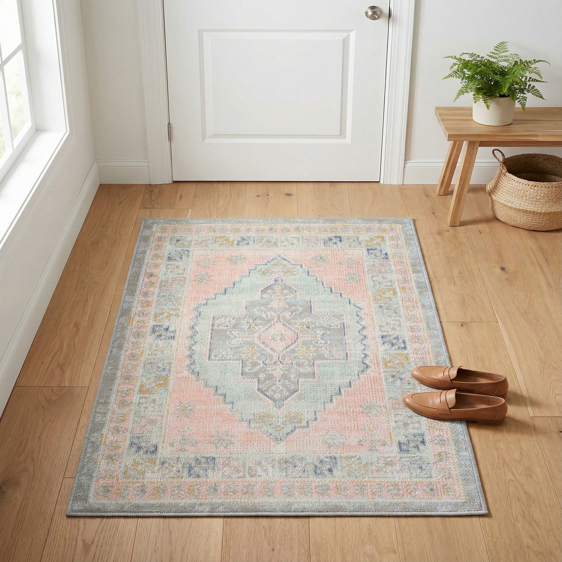 Use this rug as an accent in small spaces where its color story can shine — layered on top of a larger neutral rug, at the foot of a bed, or in a nursery or powder room to add a soft, pastel touch. It also complements coastal, modern-boho, or soft-traditional schemes: pair it with light wood tones, pale gray or off-white walls, and brass or gold accents to bring out the warm metallics, or coordinate with linens in mint and pale blue for a cohesive, soothing palette.