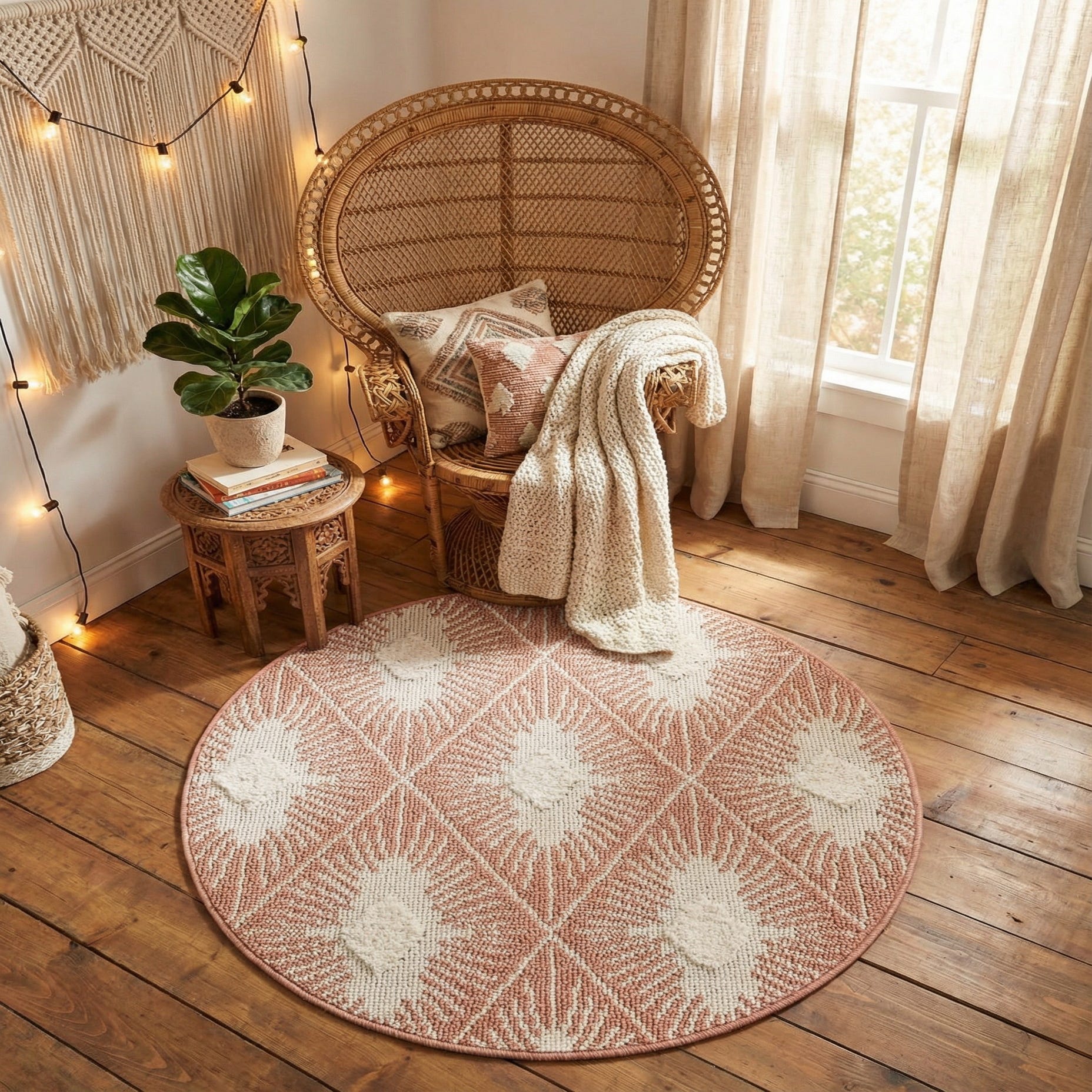 A 3' 3 round pink and white bohemian rug with a textured trellis pattern, featuring a thin pile.
