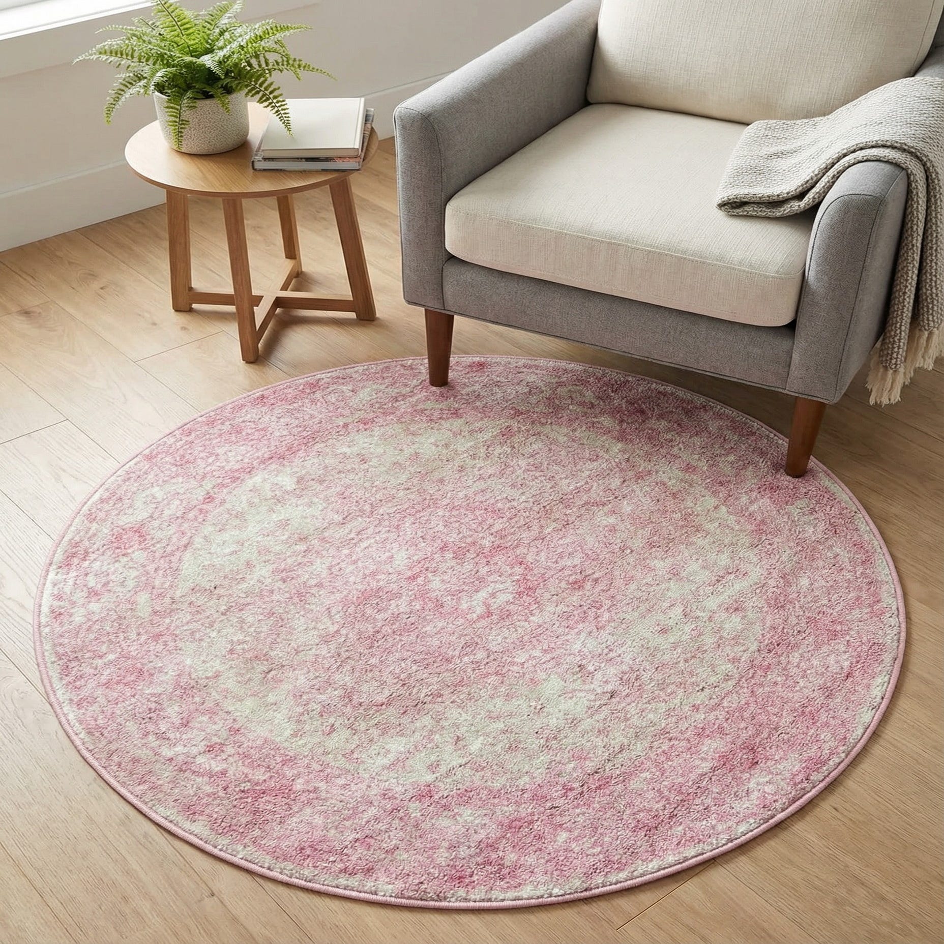 The round shape and muted palette work well in a nursery, a bedroom seating area, or beneath a small round table in an entry or breakfast nook. Pair this rug with light woods, ivory linens, and warm metallic accents for a contemporary-feminine look, or layer it over hardwood floors in a cottage-inspired or transitional interior to soften the space and tie pastel tones together.