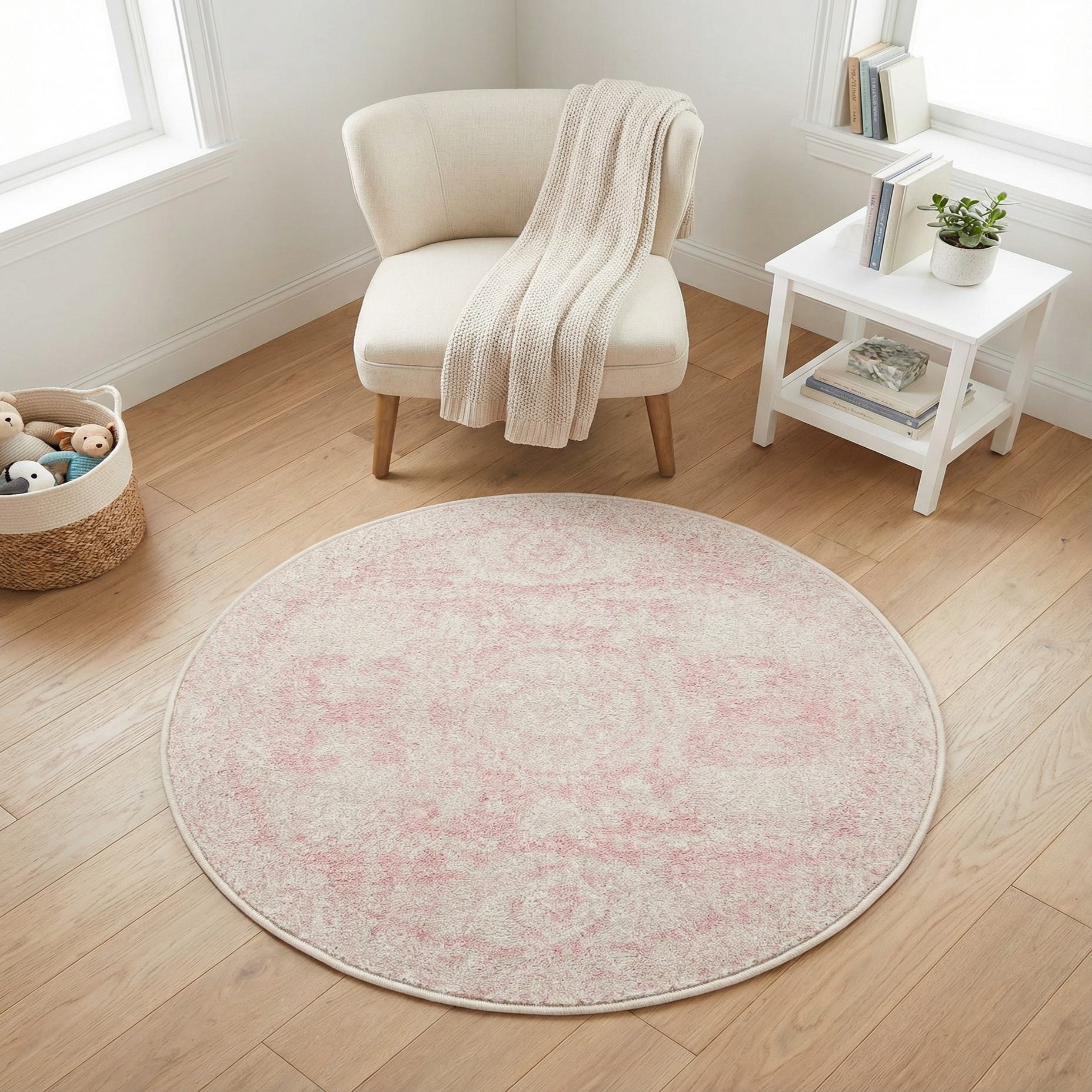 A soft pink field is gently washed with an ivory, faded medallion motif that gives this round rug a quietly vintage look. The pattern is low-contrast and artfully distressed, so the medallion and surrounding flourishes sit just beneath the surface rather than dominate it. Machine-made from 100% polypropylene, the pile has a short, dense hand that feels soft underfoot while maintaining a uniform texture and color across the face.