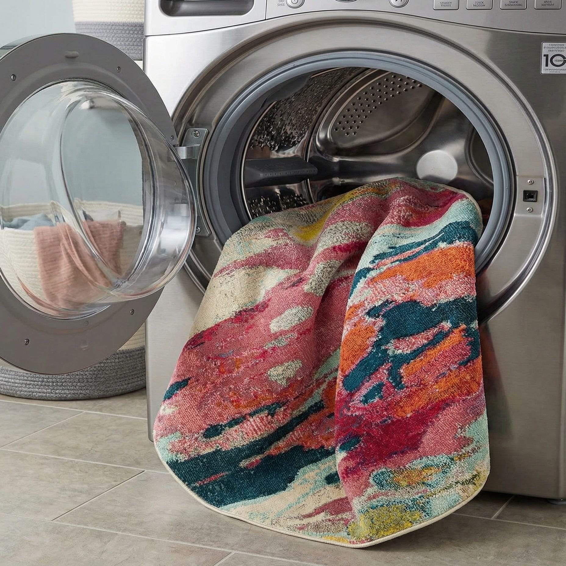 This round design works well beneath a small bistro table, in front of a cozy reading chair, or centered in a child’s play corner to add color and pattern without overwhelming the space. It pairs naturally with mid-century modern furniture, natural wood tones, or neutral upholstery when you want the rug to be the focal point, and it complements jewel-toned accents and textured throws when layered into a more eclectic living room or bedroom scheme.