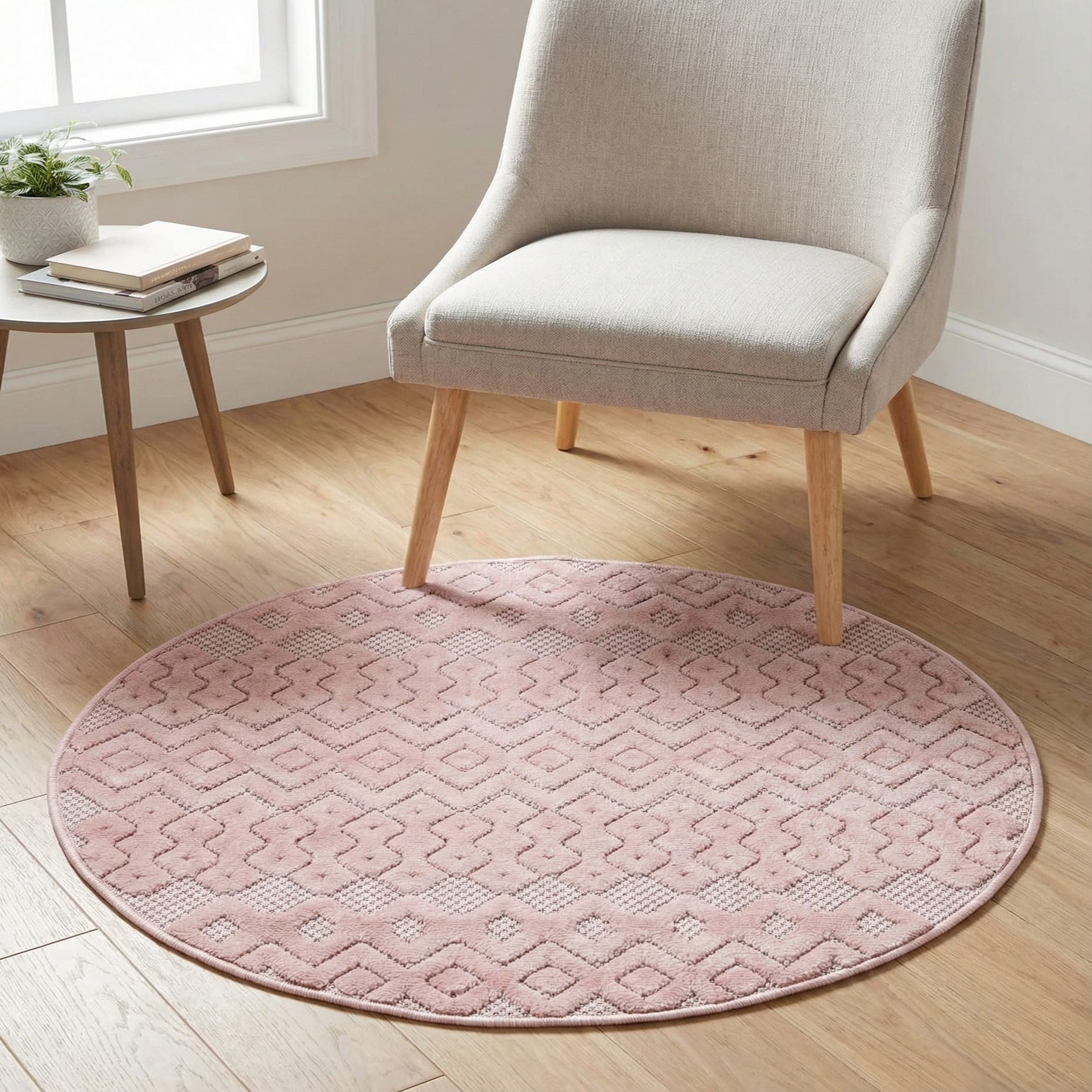 The Outdoor Trellis Textured rug is a versatile and stylish addition to any outdoor living space. This 3 Ft Round rug showcases a dynamic trellis pattern, offering a contemporary geometric appeal. The textured patterns are highlighted by the soft pink background, providing a subtle yet vibrant touch of color that can complement various decor styles.