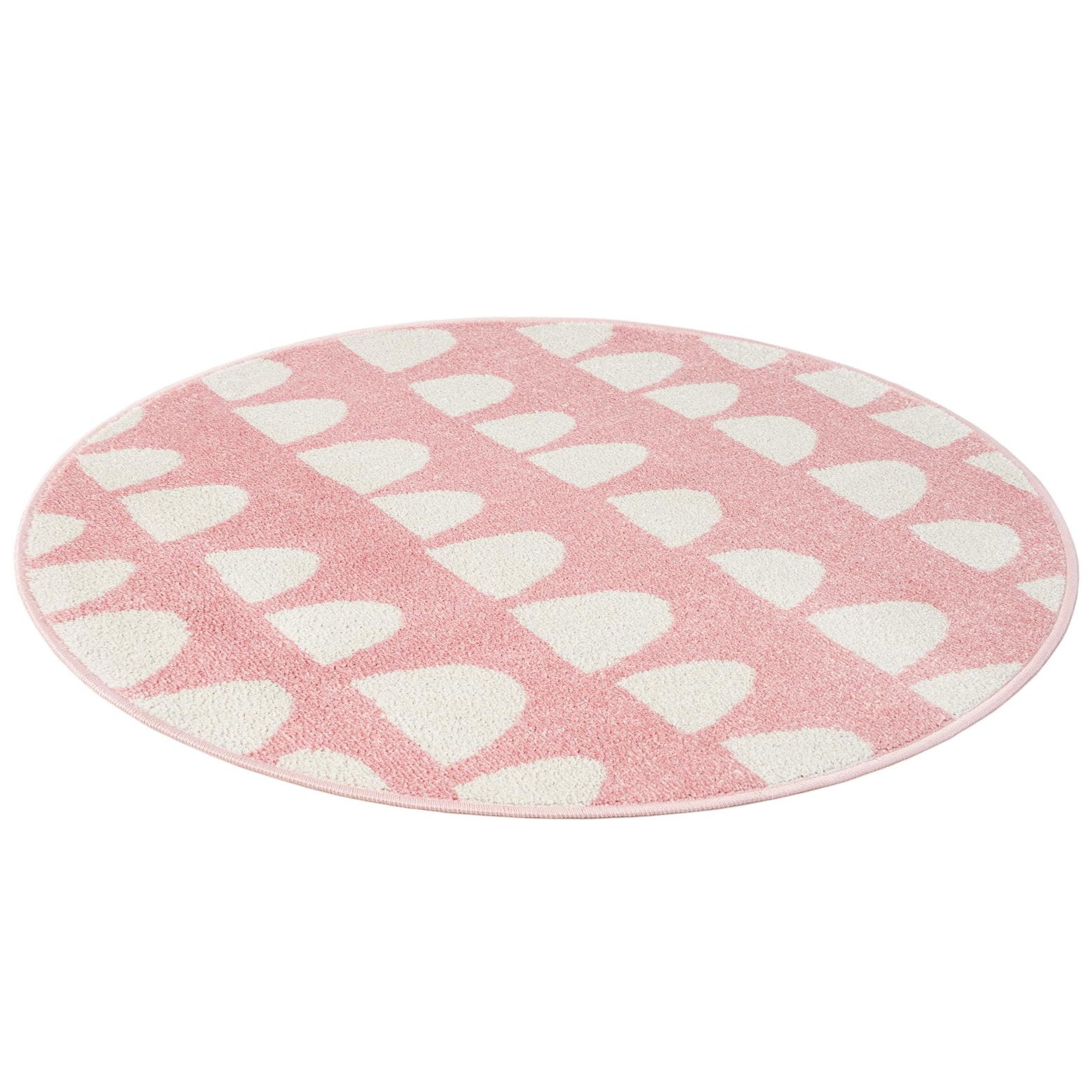 A 3' 3 x 3' 3 round pink rug with a modern abstract pattern of white half-circle shapes, suitable for a child's room.