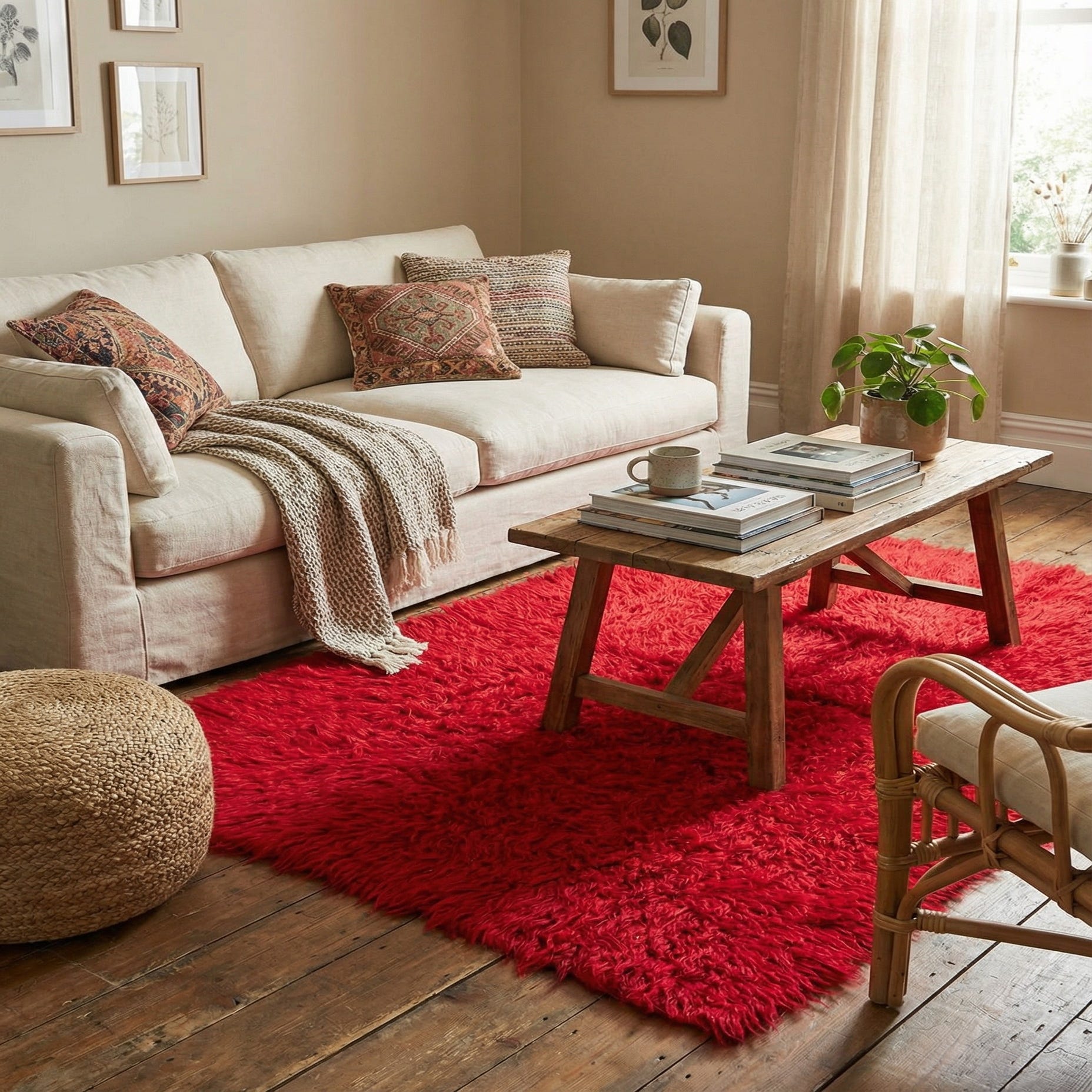 A vibrant 3x4 rectangular pink shag rug, handmade from 100% wool, featuring a plush, shaggy pile.