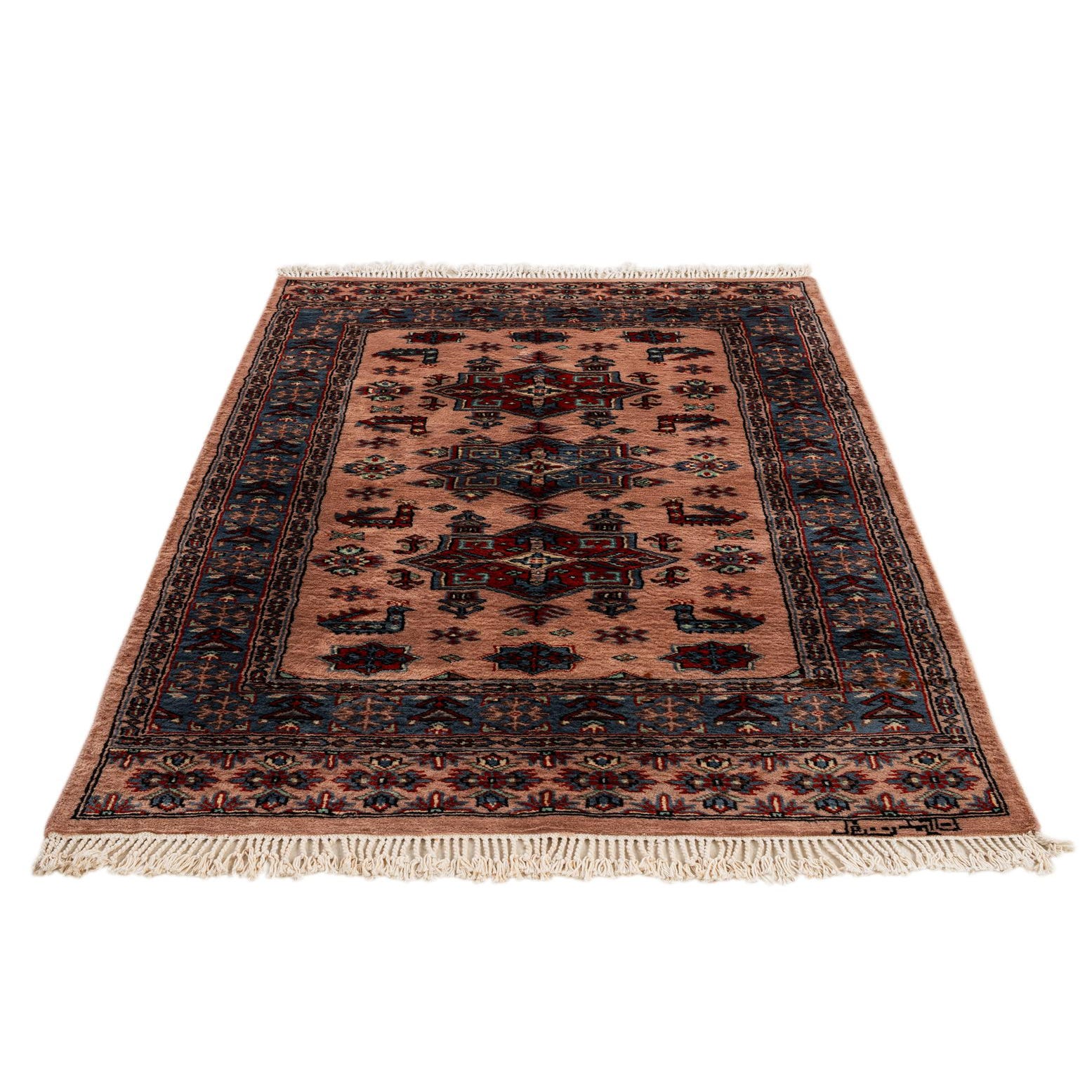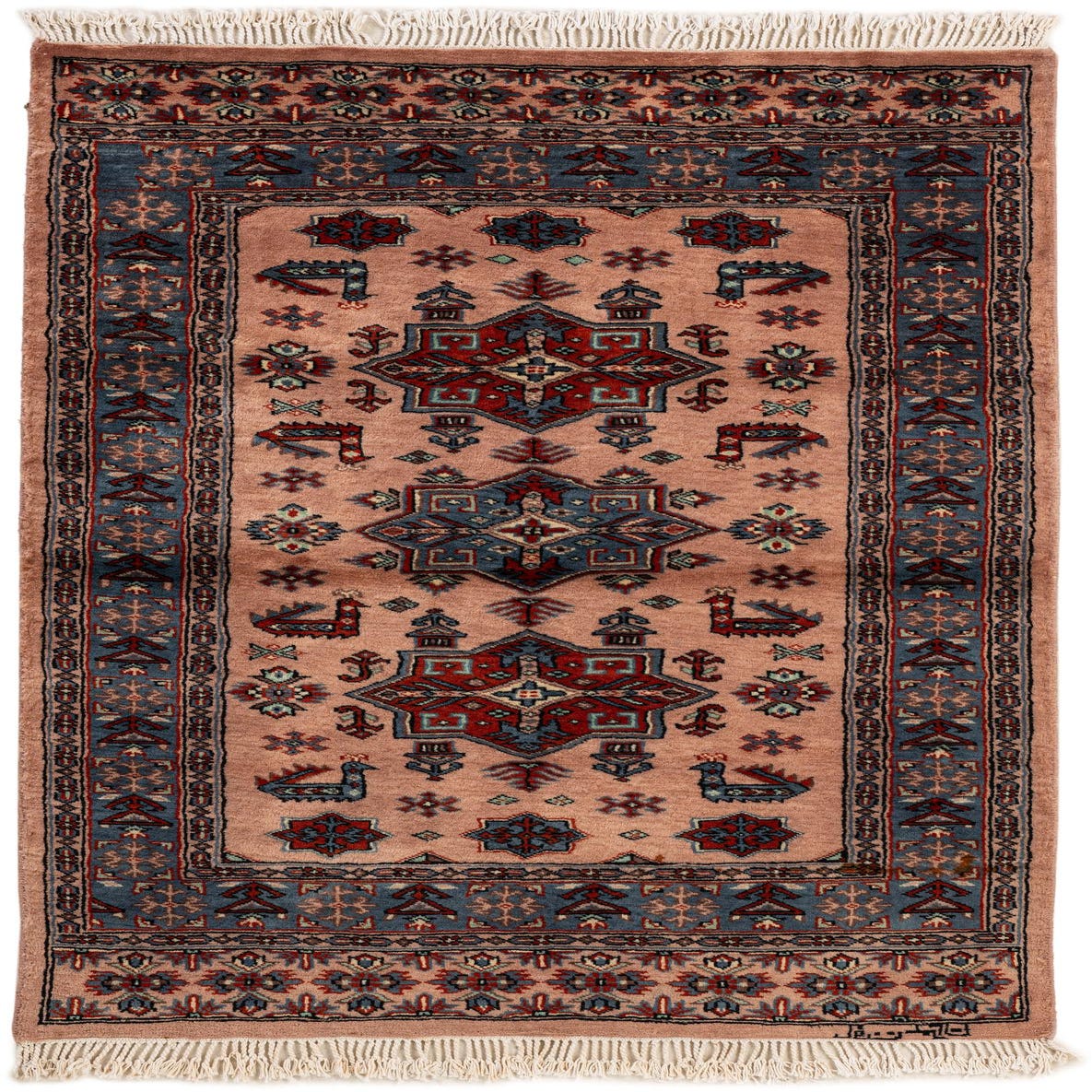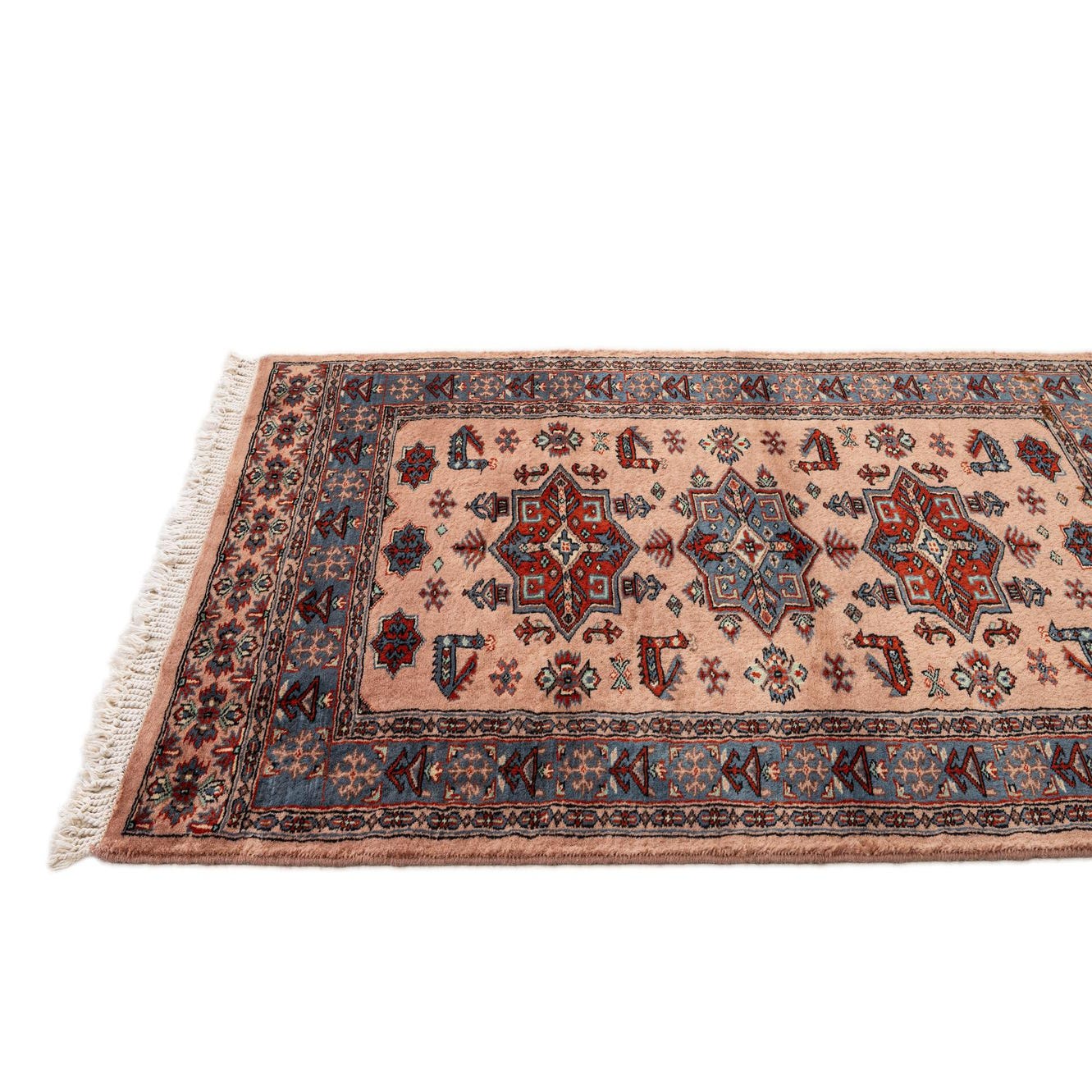 A 3x5 rectangular Bokhara rug with a pink field, featuring intricate tribal and traditional patterns in red and blue, with white fringe.