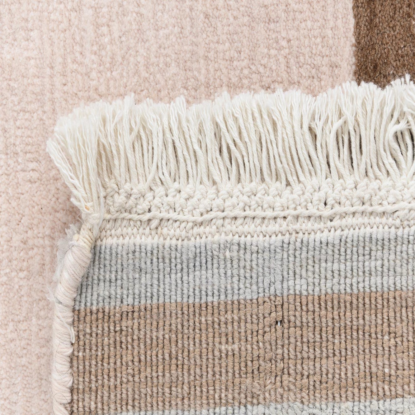 The texture of the rug is inviting and durable, suitable for everyday use in spaces seeking a touch of warmth and visual interest. The fringe detailing adds a traditional element to the rug's otherwise contemporary feel.