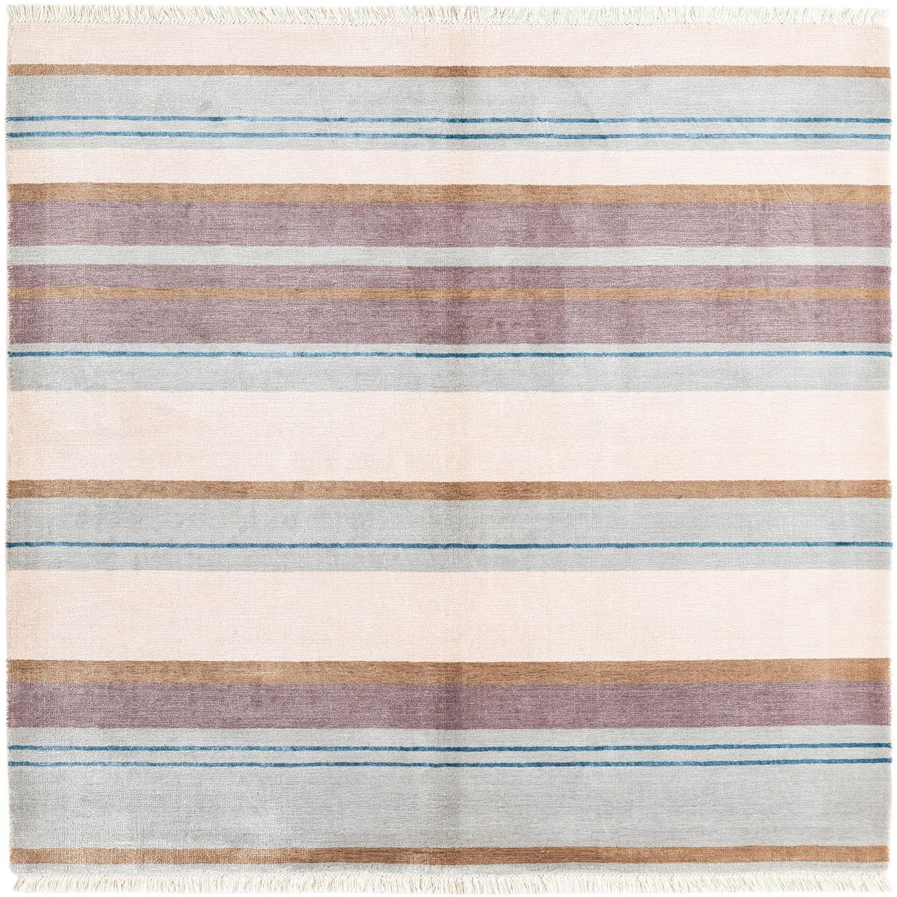 A 3x5 rectangular Darya rug featuring broad stripes in shades of pink, brown, and light blue, with thin dark blue accent lines, and fringed ends.