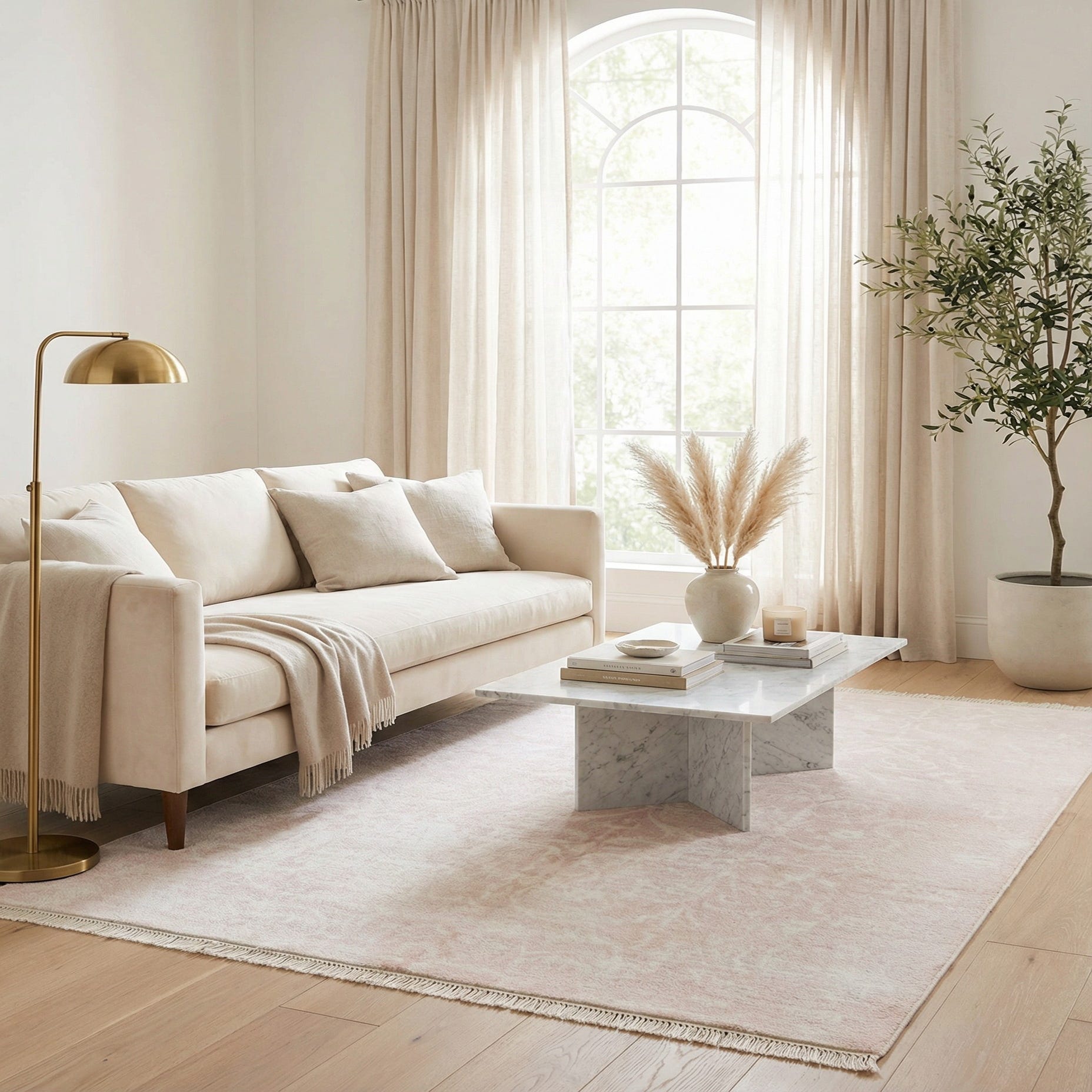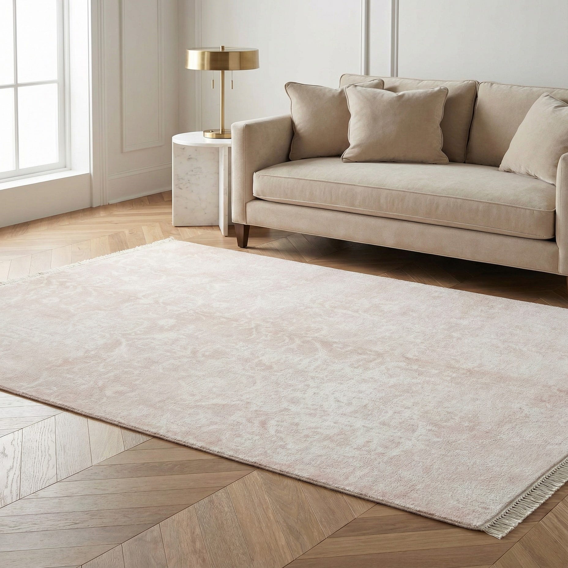 This rug is suitable for a variety of interior design scenarios. Its understated pattern can seamlessly integrate into a modern minimalist setting or enhance a romantically styled room with its warm and inviting tones. It would also be a complementary addition to a classically styled study or bedroom, where its timeless pattern can create a sense of luxury without overwhelming the space. Its soft color palette allows for coordination with a range of decor pieces, making it a functional and stylish option for various living areas.