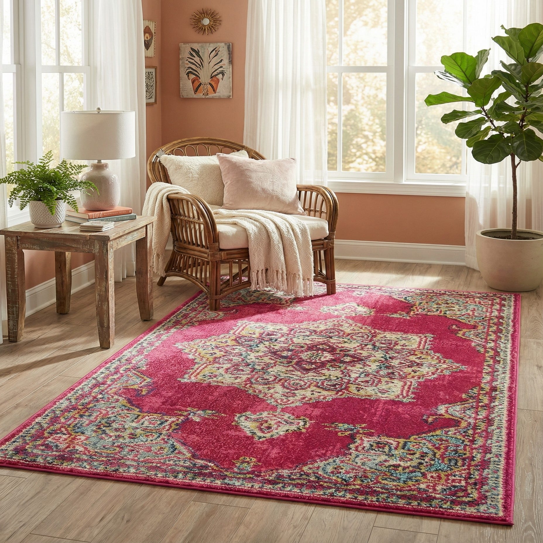 A bold, vintage-inspired medallion anchors this rug’s design, set against a rich pink field that immediately draws the eye. The central beige and gold motif is finished with layered accents of light green, navy blue, puce, and violet that create depth and a slightly distressed character. Machine made from 100% polypropylene, the pile reads soft and slightly lustrous to the touch, with a low-to-medium height that presents the detailed pattern clearly while offering a welcoming underfoot feel.