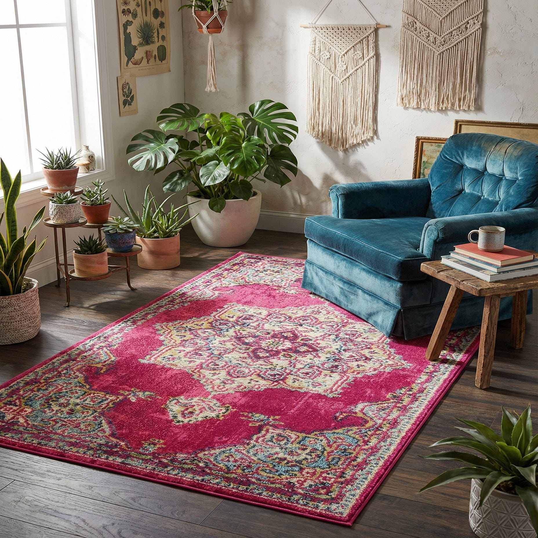 This rug works well as a color-forward anchor in a bedroom or a cozy reading corner, or placed in an entryway to introduce personality at the threshold. It pairs nicely with warm wood tones and brass or gold accents for a modern-glam look, or with neutral furnishings and layered textiles for an eclectic or bohemian scheme. The vivid pink field also complements jewel-toned pillows and navy or violet accessories when you want a lively focal point without changing the entire room.