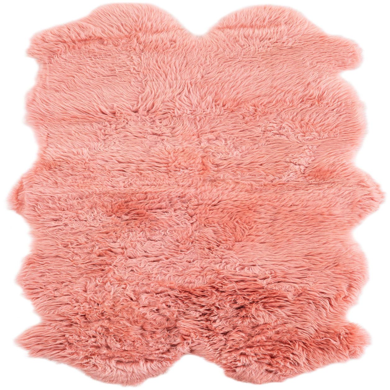 A plush, freeform pink lambskin rug with a medium pile, perfect for adding warmth and texture to an indoor space.