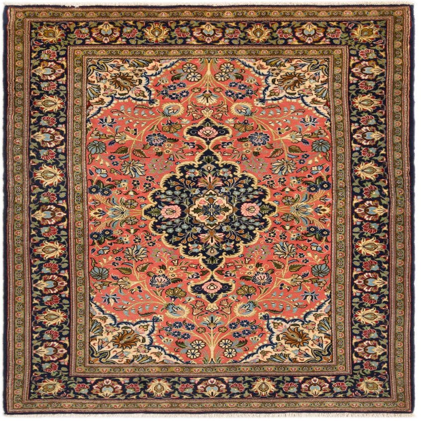 A 3x5 rectangular traditional wool rug with a pink field, navy border, and intricate floral medallion pattern.