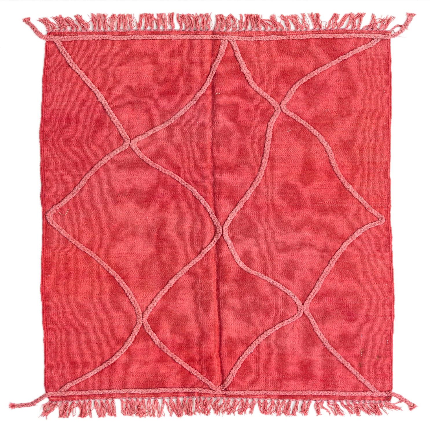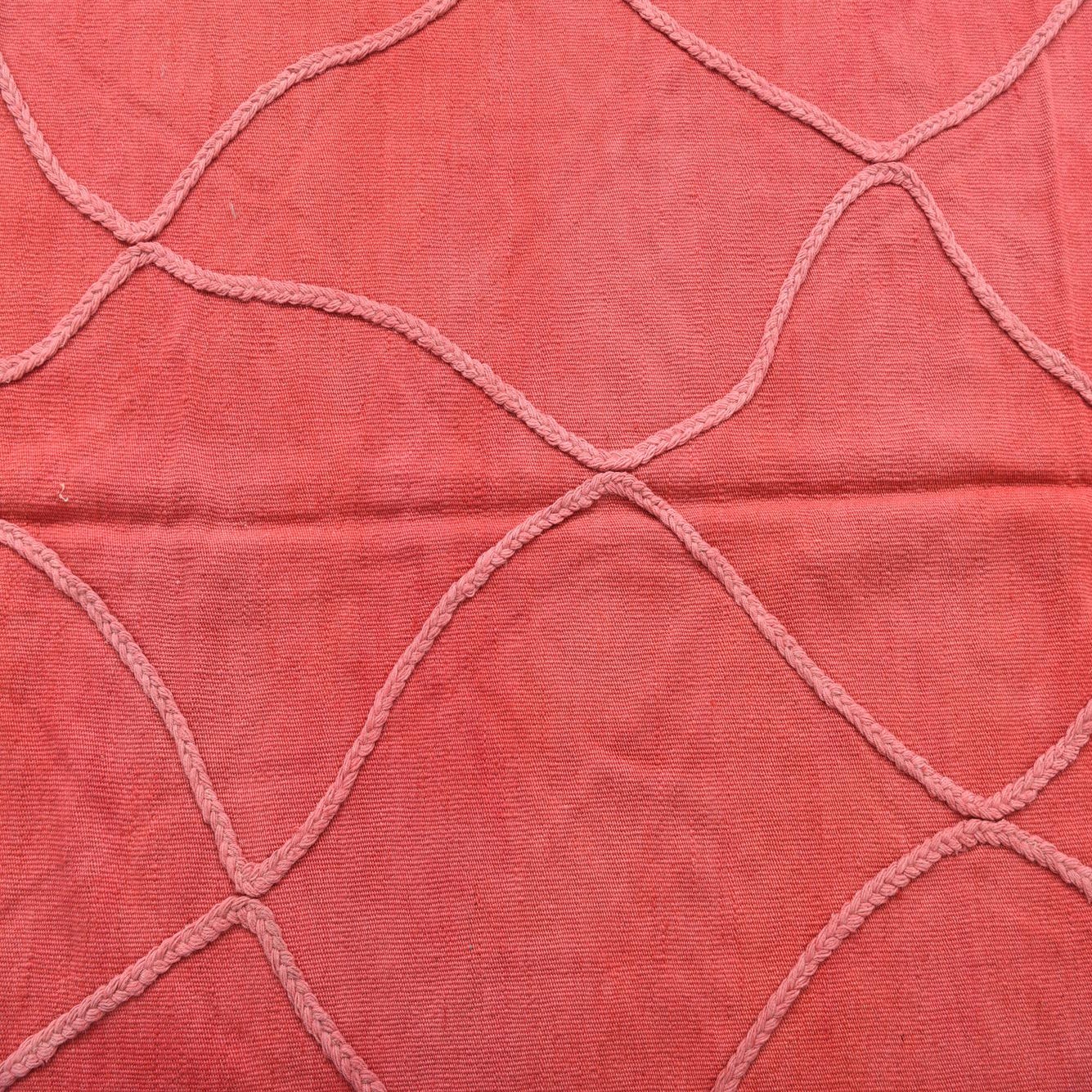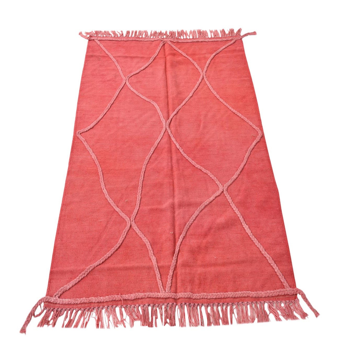 Hand-woven from 100% wool, this rug has a warm pink ground punctuated by a simple, oversized geometric lattice created from raised braided wool lines. The braided cords form soft, curving diamonds that add three-dimensional texture against a low, dense pile. Subtle tonal variations in the pink background and the short fringes at each end give the piece a handcrafted, lived-in look that feels tactile underfoot.