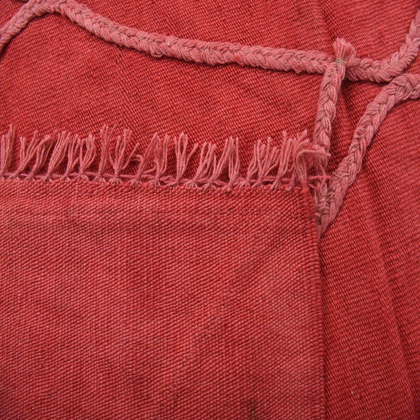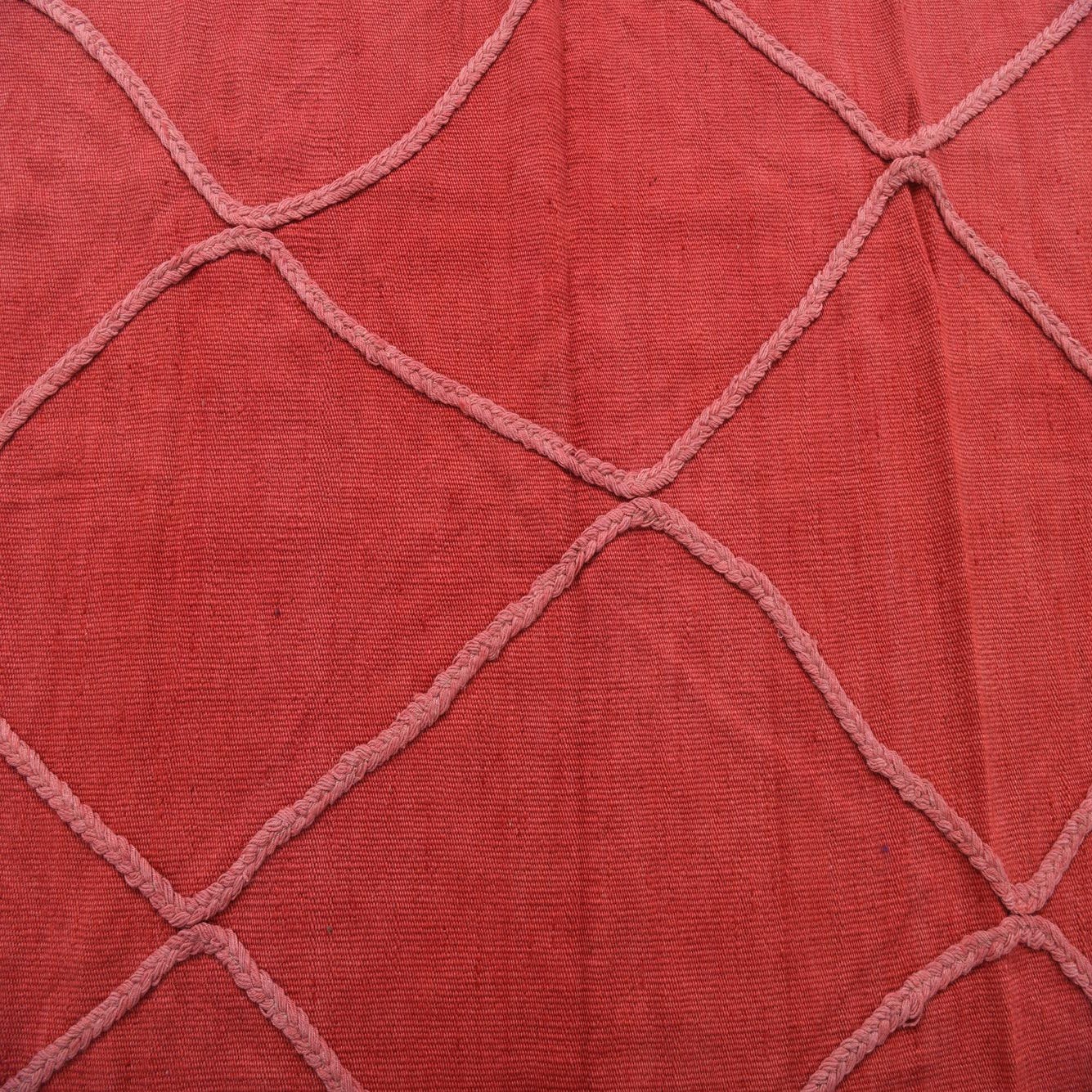 Hand-woven from 100% wool, this rug has a soft, low-profile base topped with raised, braided lines that create an elongated diamond lattice across a warm pink field. The flat-woven ground feels pleasantly dense underfoot while the rope-like pattern adds a subtle plush contrast and a tactile, hand-crafted character. Short fringes at the ends and slight tonal variations in the dye give the piece an artisanal, lived-in look that balances modern geometry with traditional weaving techniques.