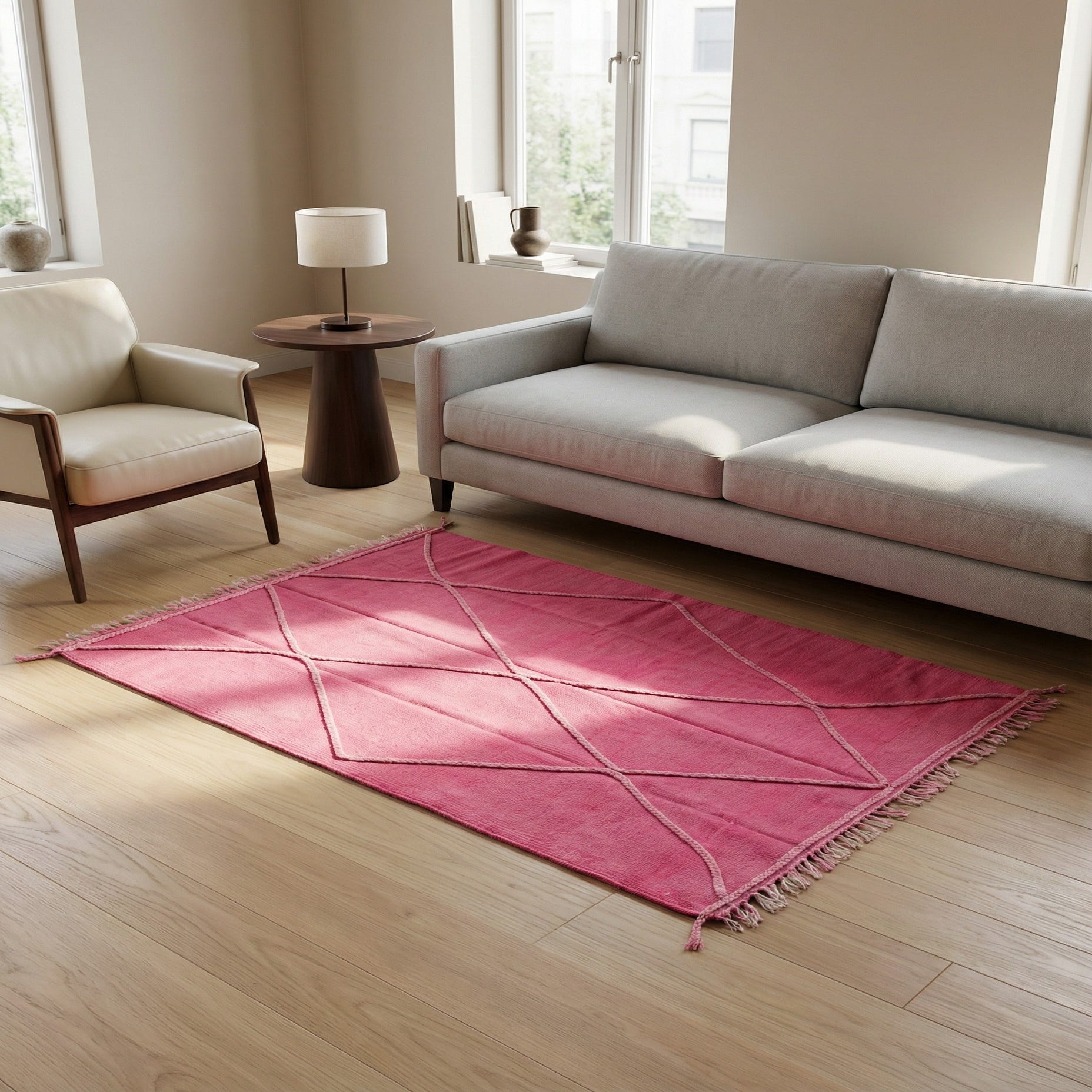The Kilim Modern collection presents a hand-woven 3x5 rug, meticulously crafted from 100% wool. This piece showcases a vibrant pink background, accented with a simplistic yet elegant geometric pattern in a lighter contrasting hue. The design features a series of interconnected diamond shapes, giving the rug a sense of harmony and continuity. Completed with a fringe on either end, it adds a touch of traditional charm to the overall contemporary aesthetic.