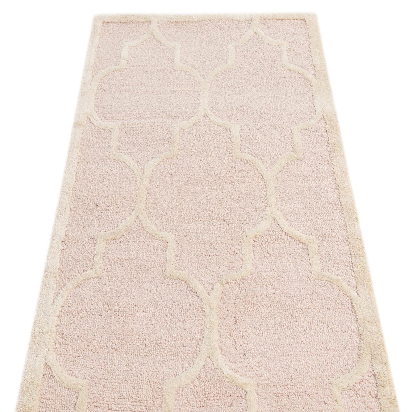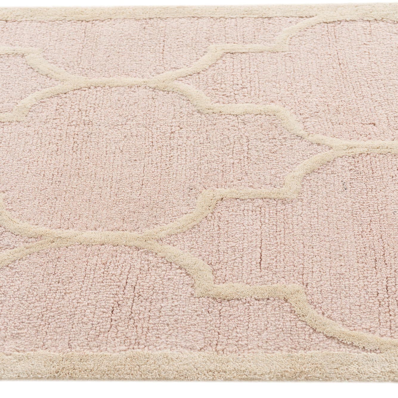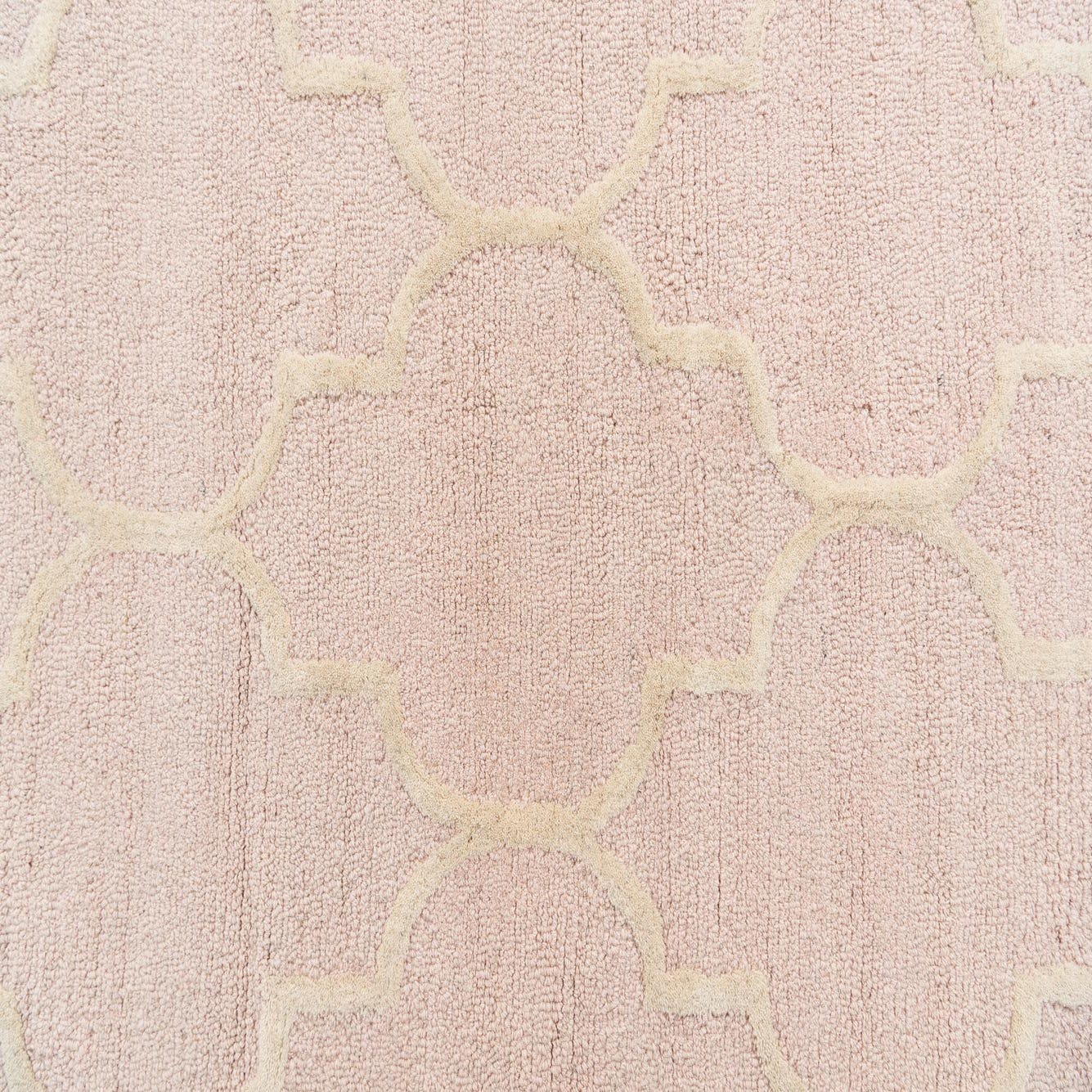 A 3x5 rectangular pink and cream modern abstract rug with a high pile, featuring a repeating quatrefoil pattern.