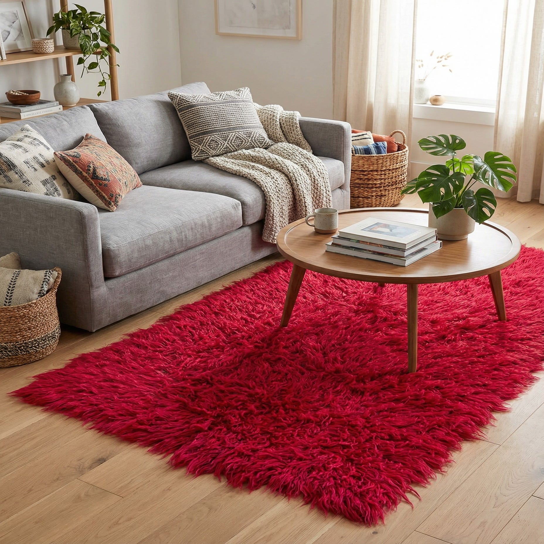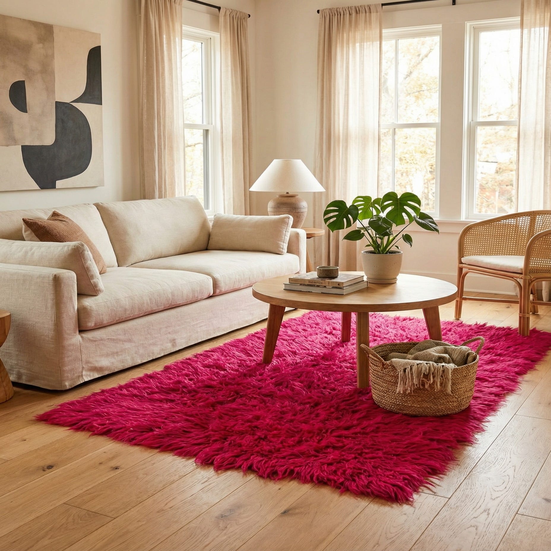 This rug works well as a bold accent in a modern or eclectic living room, layered over a larger neutral rug to add color and softness, or placed at the foot of a bed or beside a dressing area for a tactile landing spot. It also complements boho and glam interiors where rich textile texture and a strong color statement enhance seating nooks, vanity zones, or small lounge corners.