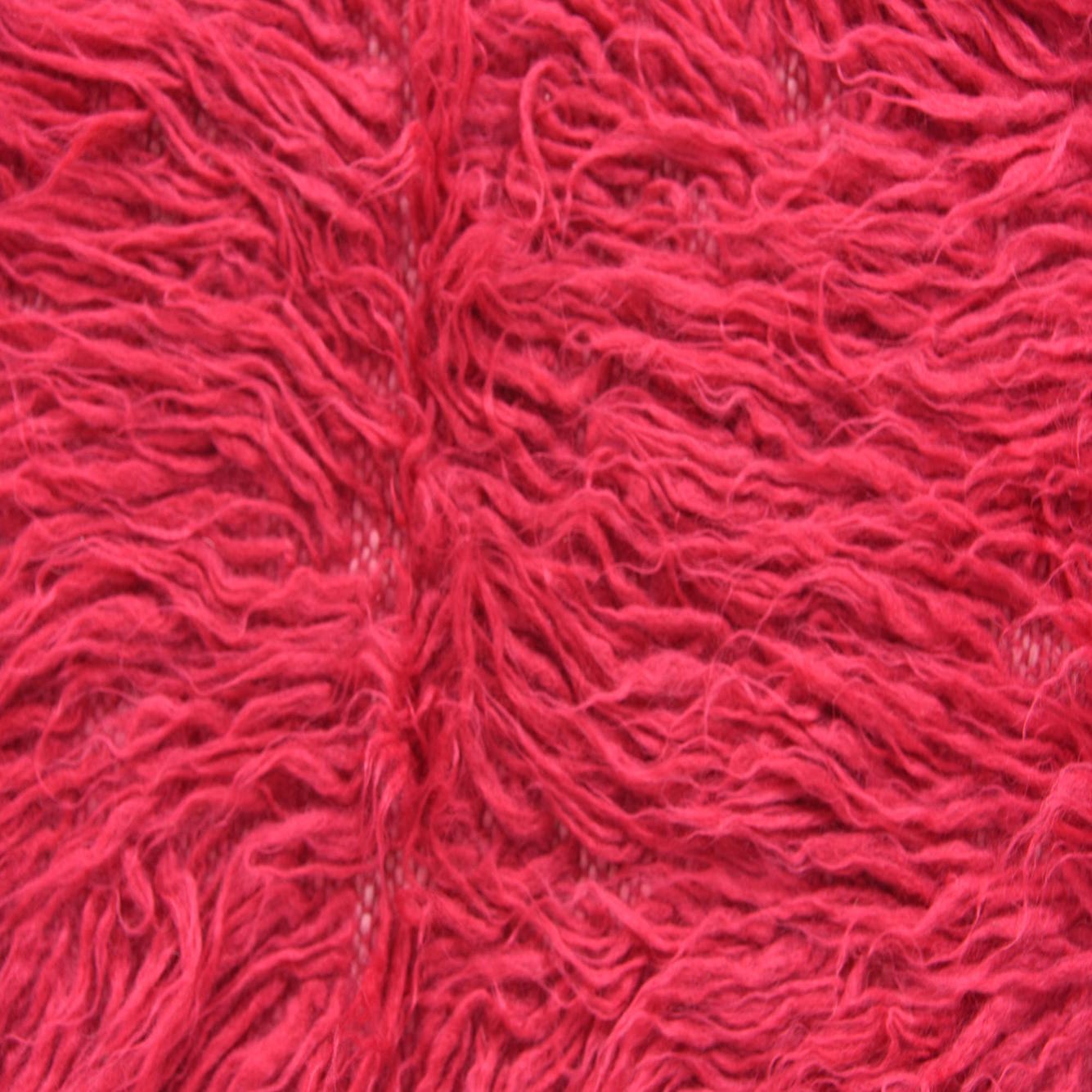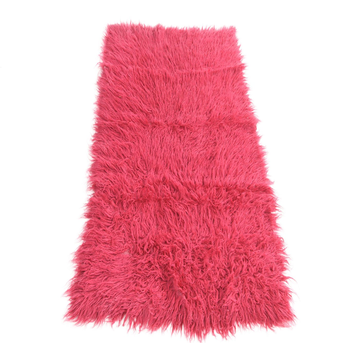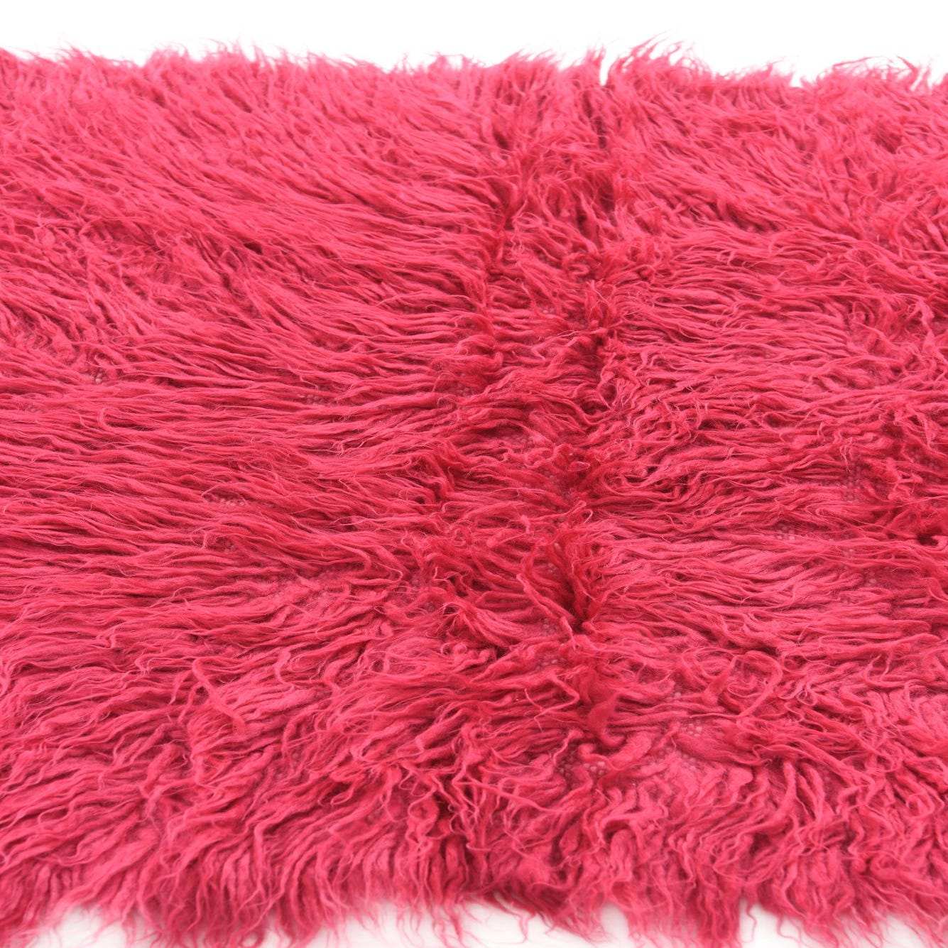 Hand-knotted from 100% wool, this piece presents a deep, long-pile shag in a saturated pink that reads vivid and confident. The surface is uniformly plush, made up of long, slightly curly wool strands that create a soft, tactile field with subtle sectional seams that add a handcrafted, panel-like rhythm across the rug. There is no printed motif—its visual interest comes from the rich color, pile direction, and the textured, cozy presence of the wool.