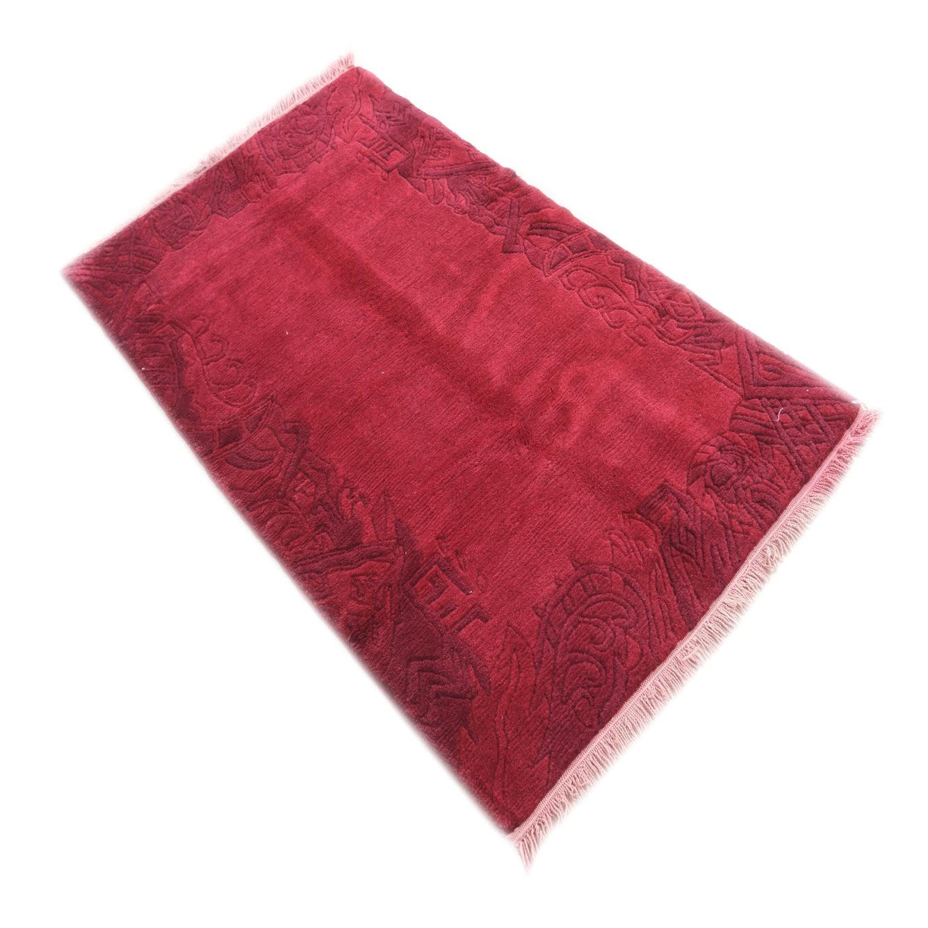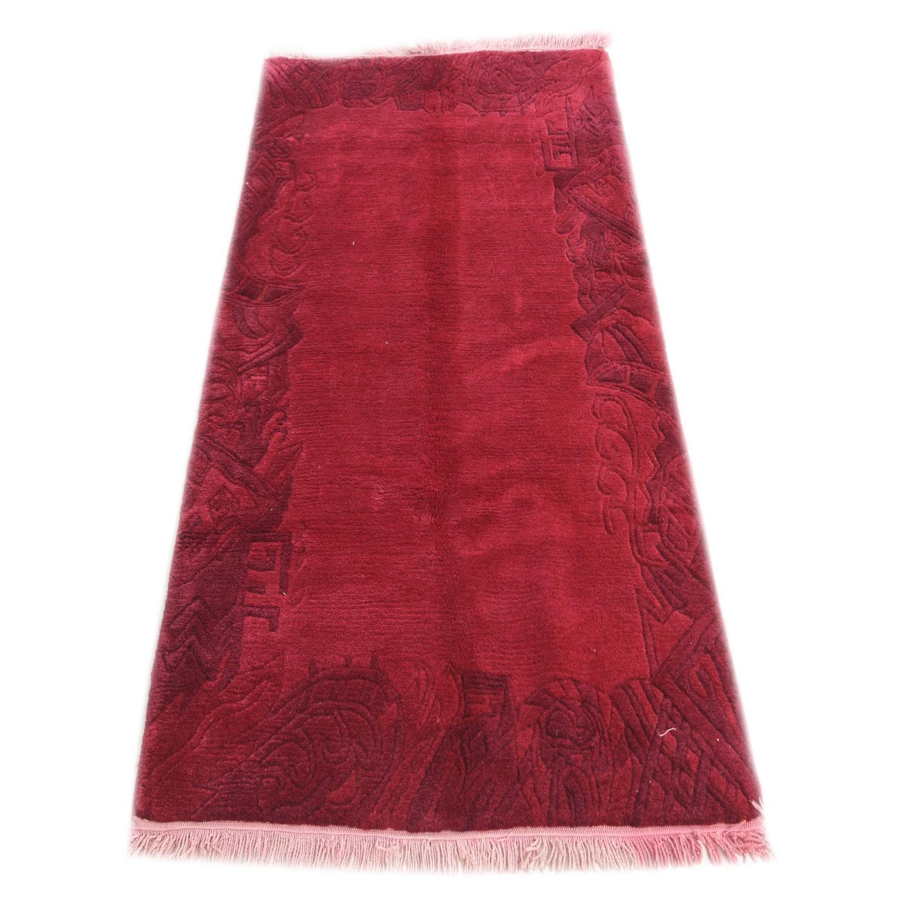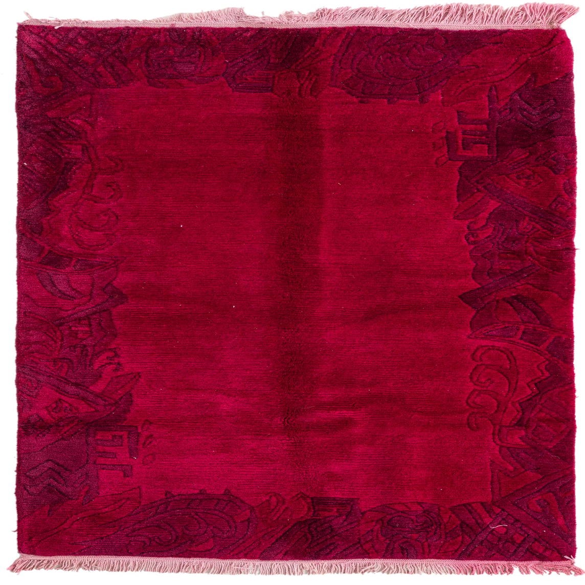 A 3x5 rectangular pink wool rug with a high pile and a dark pink abstract border pattern, featuring light pink fringe.