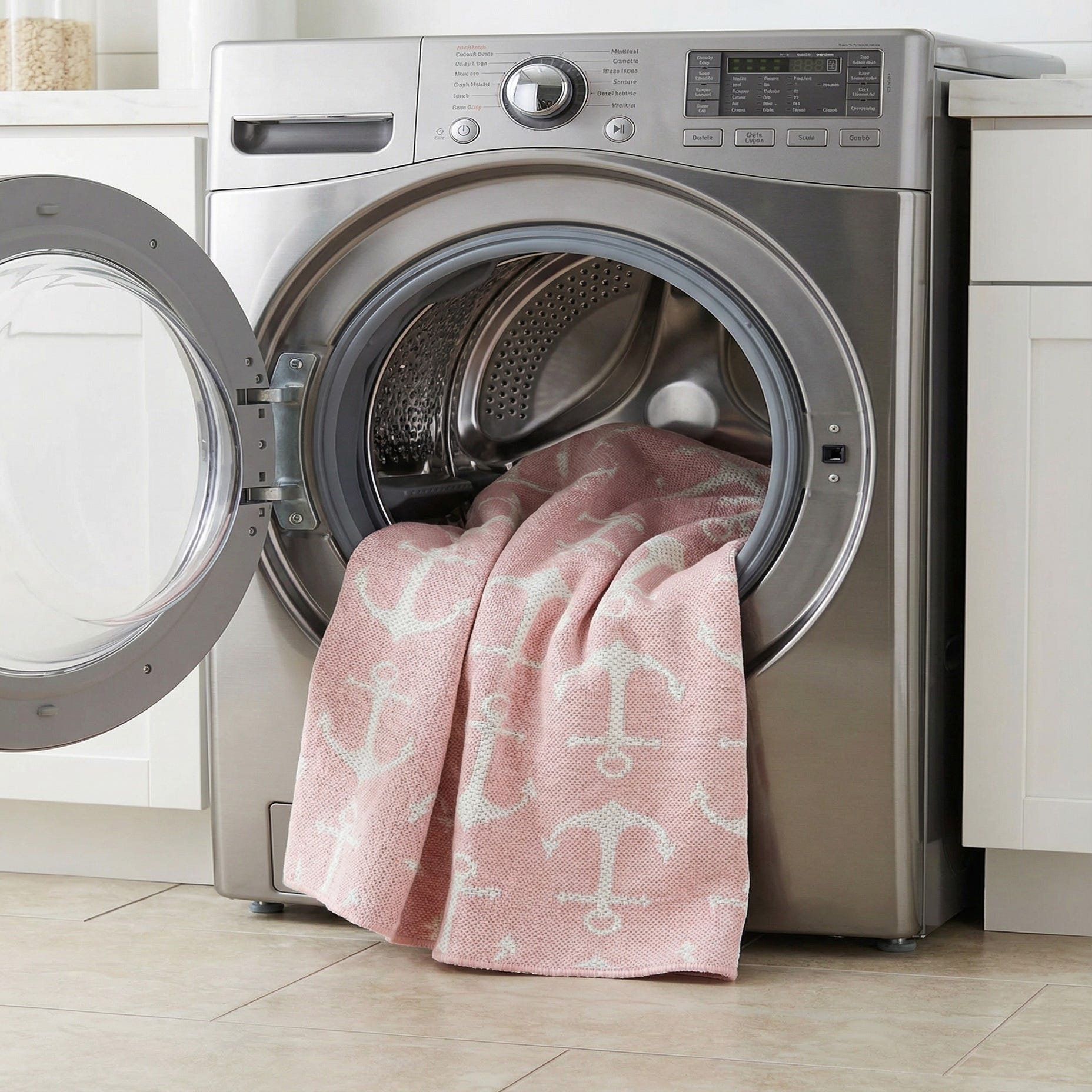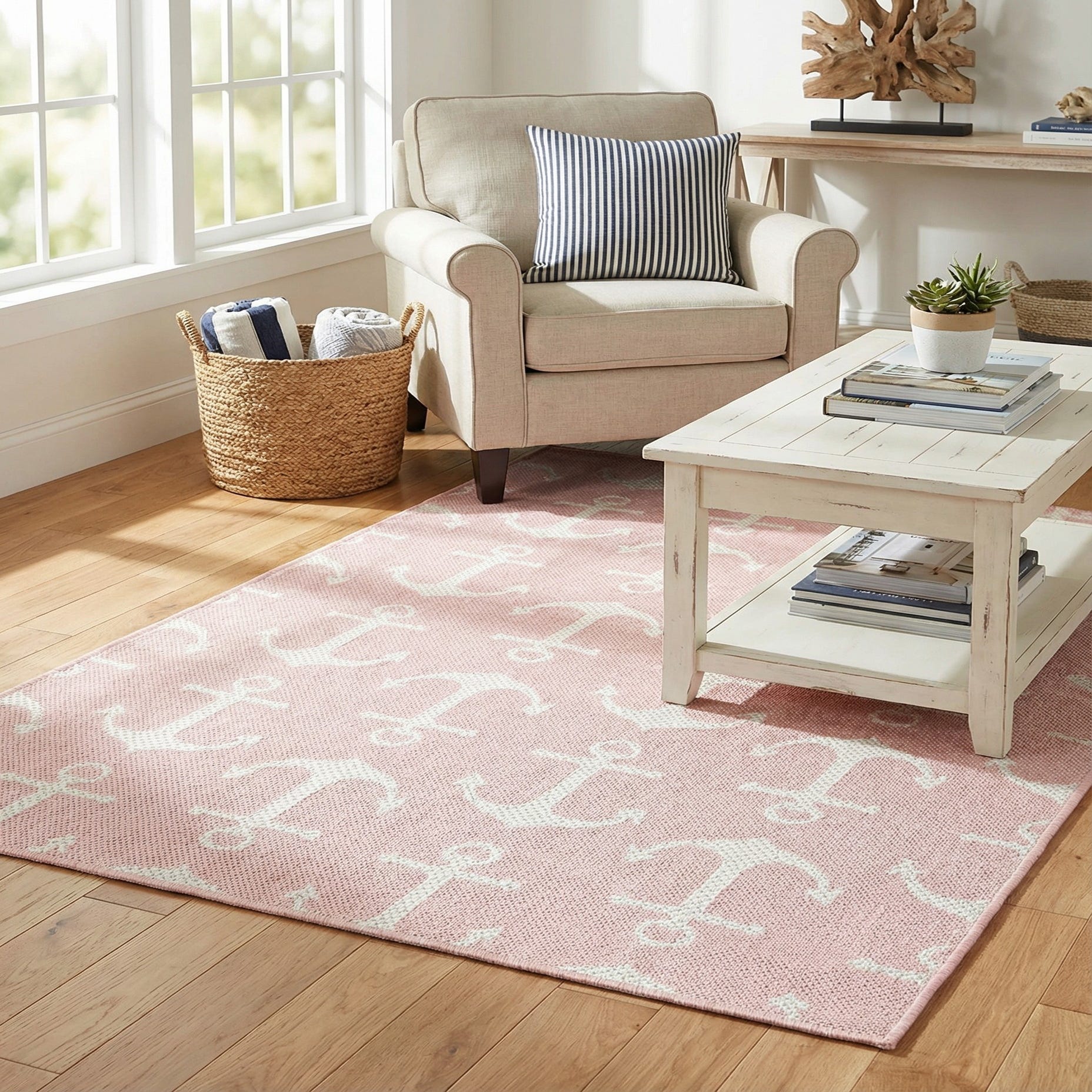 A soft pink ground provides a warm, coastal backdrop for a repeating ivory anchor motif. The allover pattern is clean and evenly spaced, giving the rug a nautical yet understated look. Machine-made construction creates a low-profile, tightly woven surface with a slight texture you can feel underfoot—the pattern sits smoothly into the weave rather than piling up, so the rug reads crisp and finished in person.