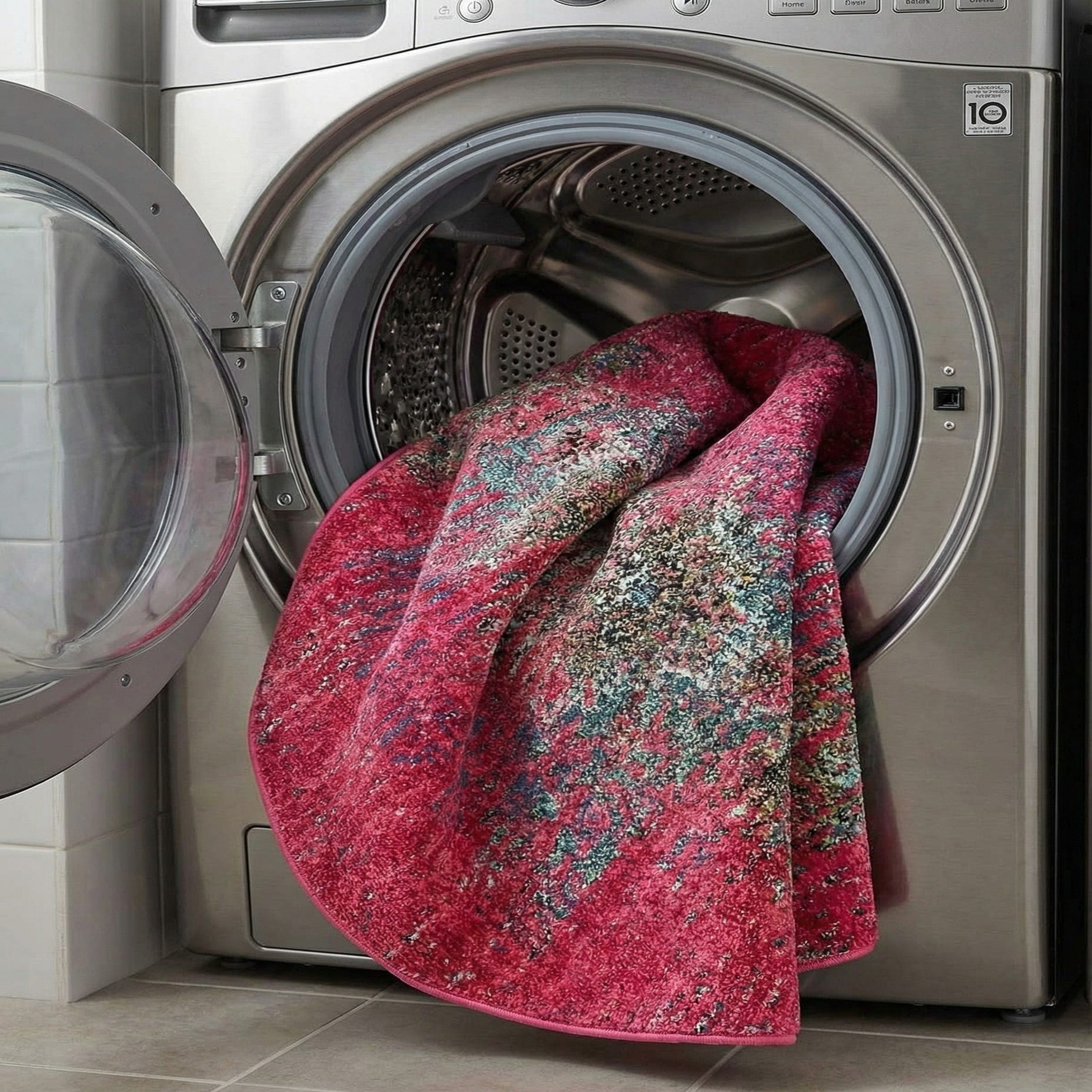 Use this piece as a color anchor in a contemporary living room layered over a larger neutral rug, beneath a small bistro or breakfast table to define an intimate dining spot, or in a bedroom seating nook to introduce warmth and pattern. It pairs particularly well with warm wood furniture, navy upholstery, or minimalist white interiors that welcome a lively pop of pink and textured detail.