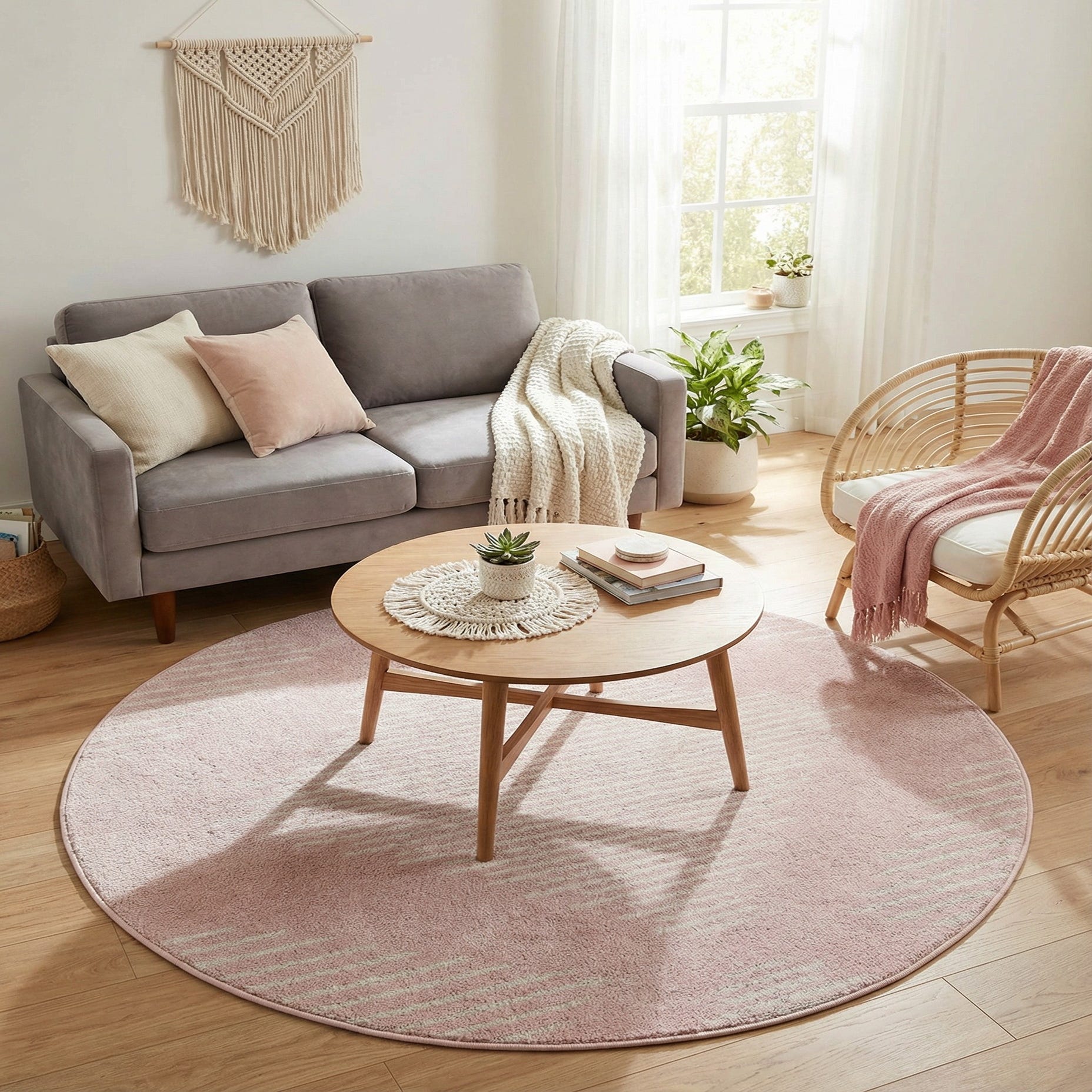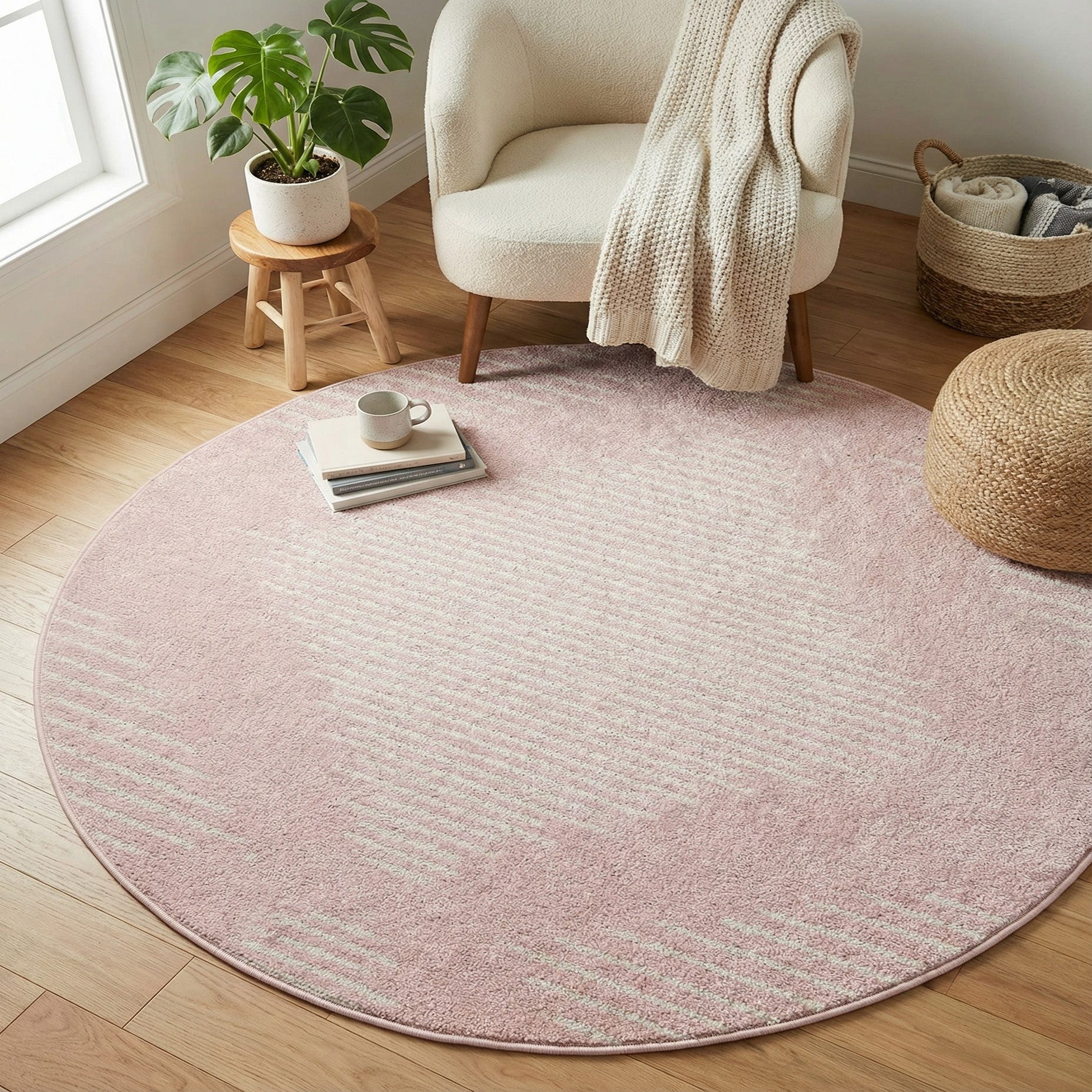 From the Kai collection, this machine-woven rug is a harmonious blend of design and functionality, crafted from 100% polypropylene for durability. Spanning 4 feet in diameter with a round shape, the rug boasts a soft pink background complemented by subtle ivory lines that create a simple yet engaging pattern. This rug's low pile makes it a suitable choice for areas with frequent foot traffic, as it maintains a sleek profile.