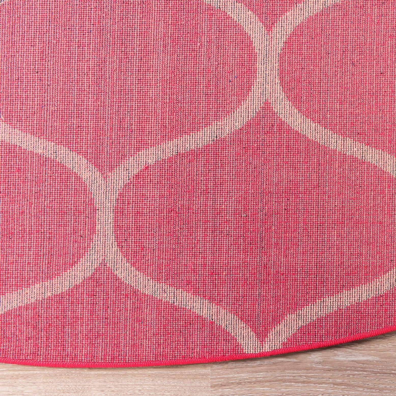 A lively lattice pattern of ivory ogee shapes sits against a warm pink background, creating a clean, modern look with soft, curving geometry. Machine made from 100% polypropylene, the rug has a dense, plush pile that feels cushioned and velvety underfoot while the ivory lines add crisp contrast and visual rhythm. The round silhouette and repeating motif give this piece a contemporary, slightly transitional character that works with a variety of décor palettes.