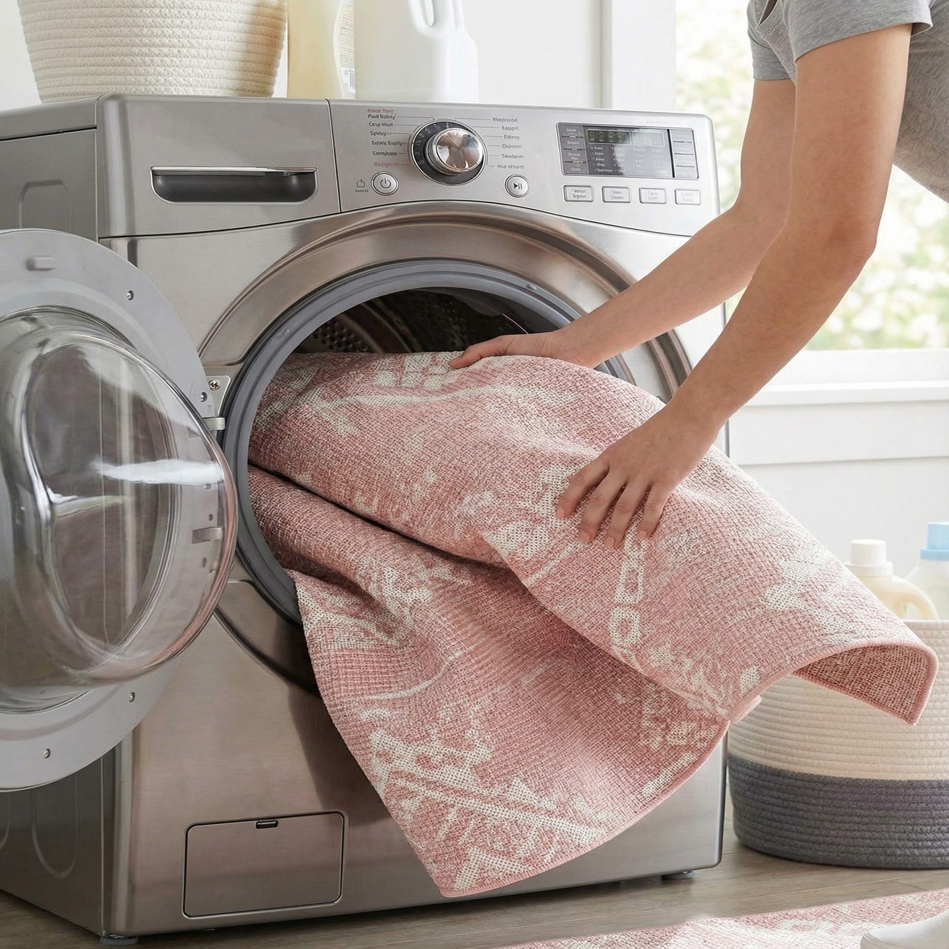 Use this rug on a covered patio or balcony to add a warm, feminine touch to outdoor seating, or bring it indoors to brighten a sunroom, breakfast nook, or children’s room. It pairs naturally with light woods, wicker or rattan furniture, ivory or cream textiles, and layered natural textures like jute or seagrass. For a cohesive look, combine it with potted greenery and soft linen cushions to highlight the rug’s casual, bohemian geometry.