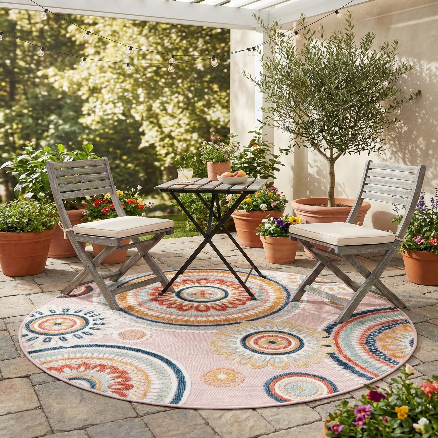 A round pink indoor/outdoor rug with a modern, abstract pattern of colorful mandalas and floral shapes in blue, orange, and white.