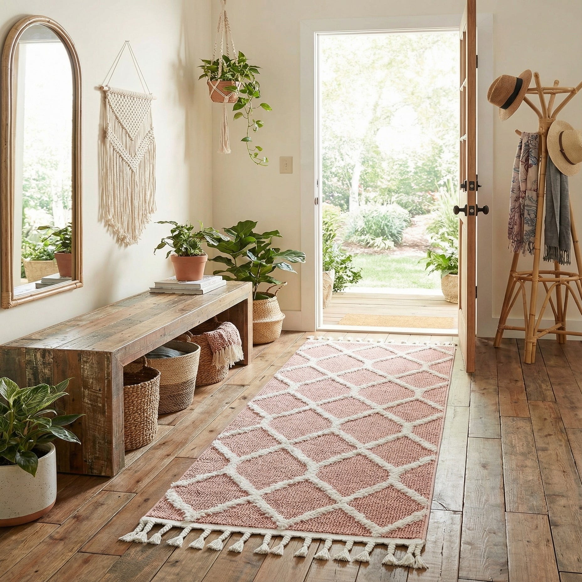 A 4 ft pink runner rug with a white modern trellis pattern and decorative tassels, ideal for hallways.