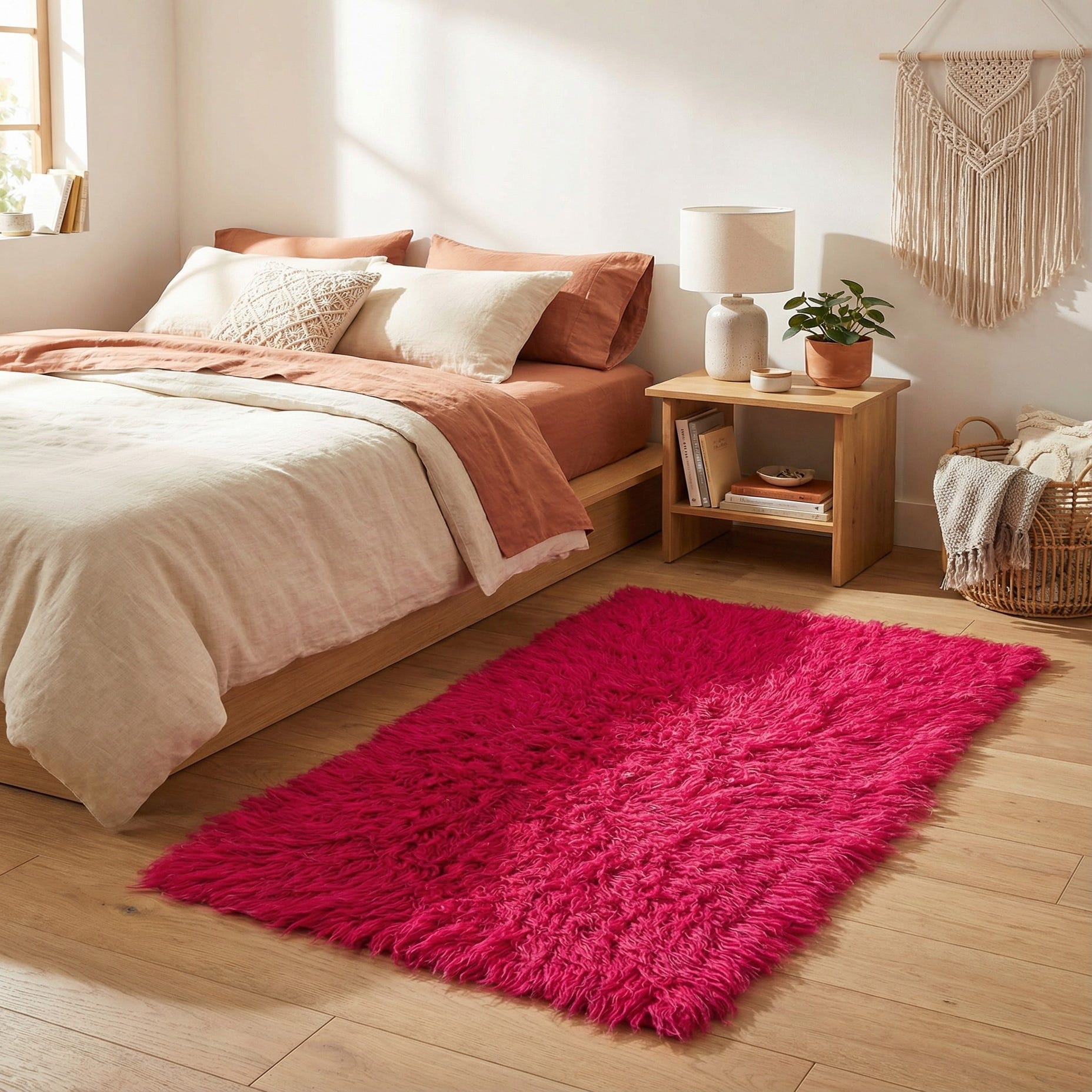 A vibrant pink 4 ft runner rug with a shaggy, high pile texture, handmade from wool, perfect for a hallway.