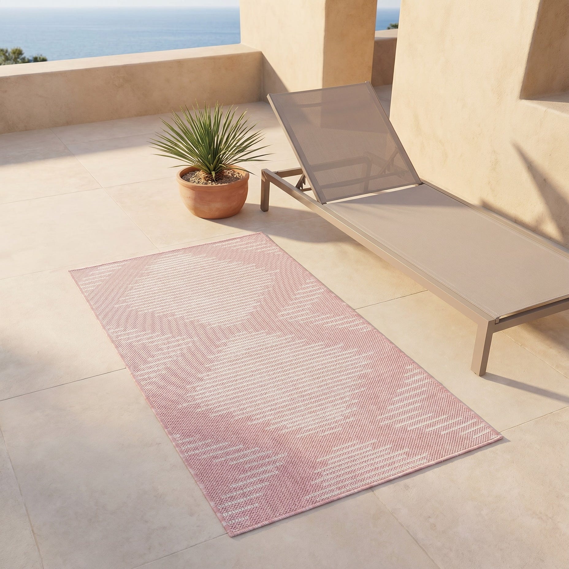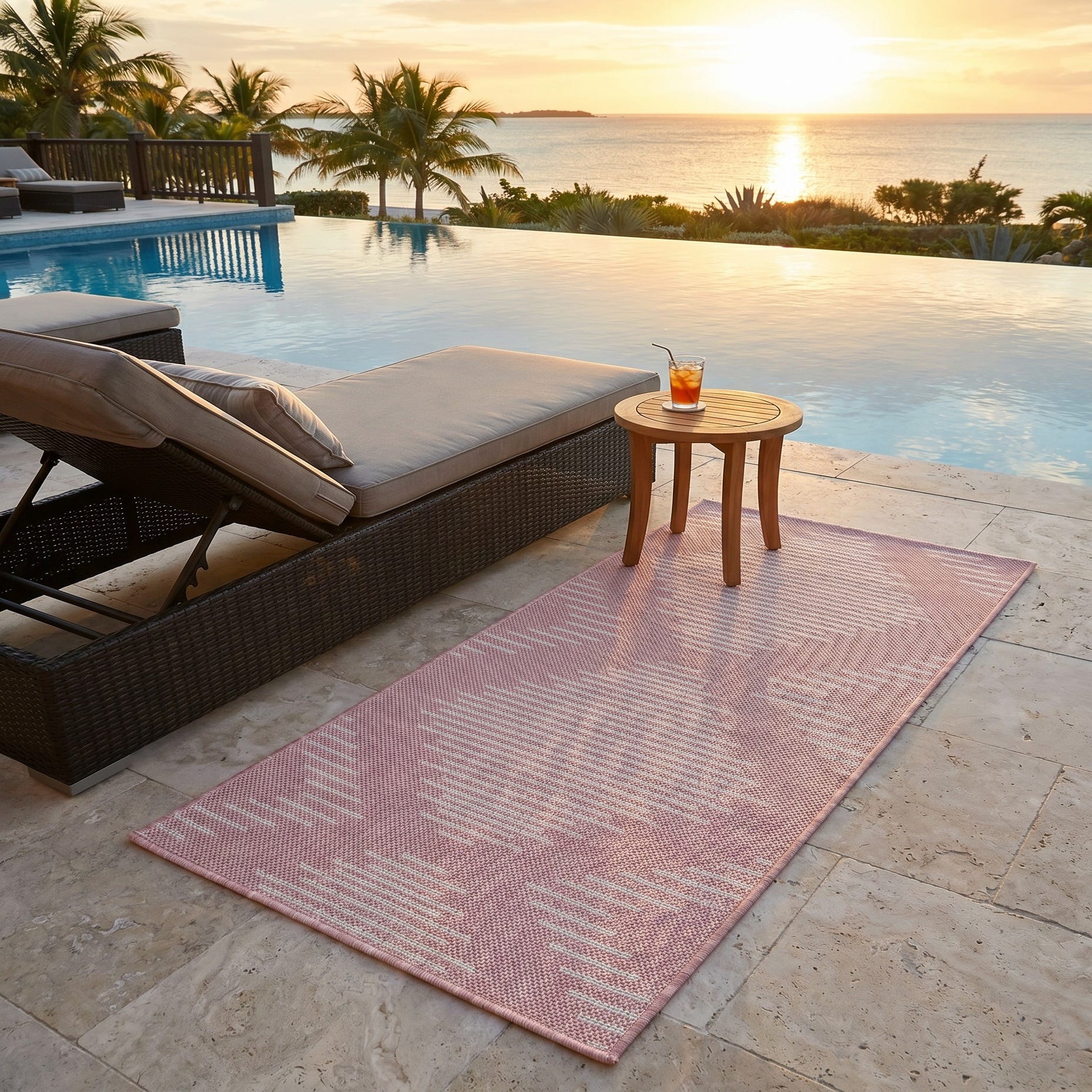 Love the contemporary look of this rug! We are so happy we chose this to accent the blue of our pool with our living area on our lanai. We still are going to add a few more pillows but love the rug to add color.
