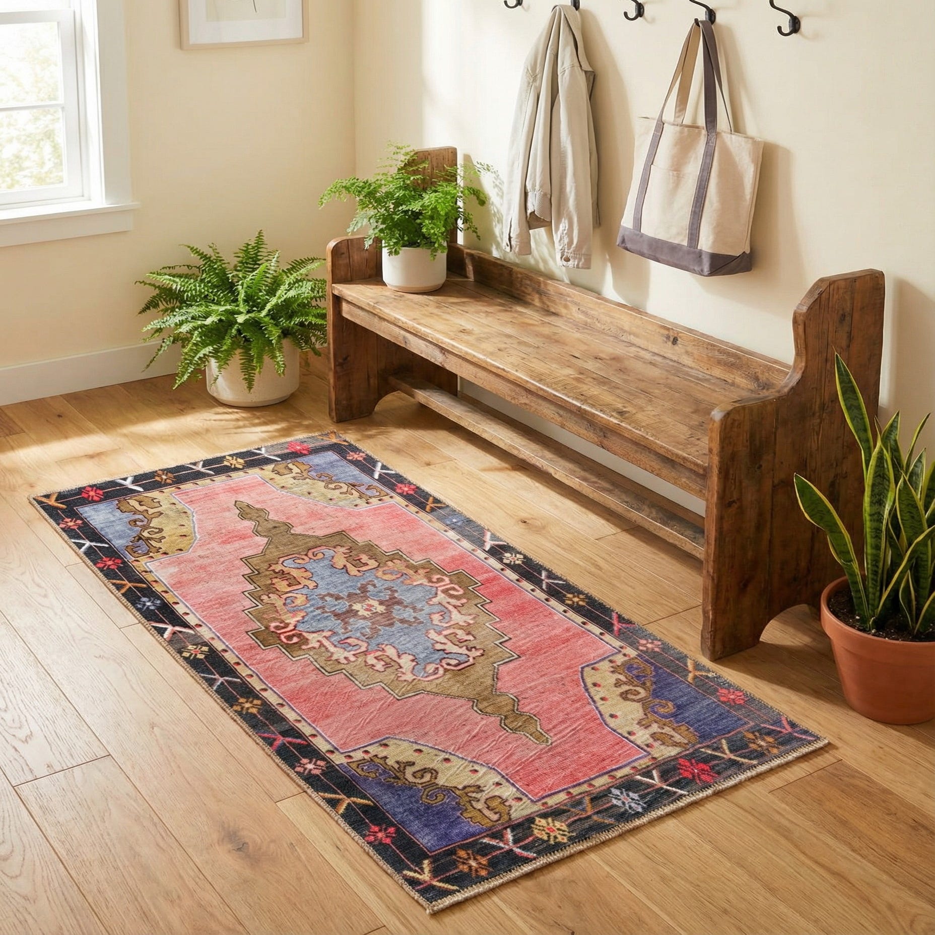 Use this runner to add color and pattern to hallways, entryways, or alongside a bed without crowding a narrow space. It pairs well with warm wood tones and brass or black metal accents that echo the brown and black details, and it layers nicely into bohemian or eclectic schemes with textured throws and pillows that pick up the blue, olive or purple hues. In a modern setting the pink field will soften clean lines, while in a vintage-inspired room the medallion and border motifs will complement aged furniture and mixed textiles.
