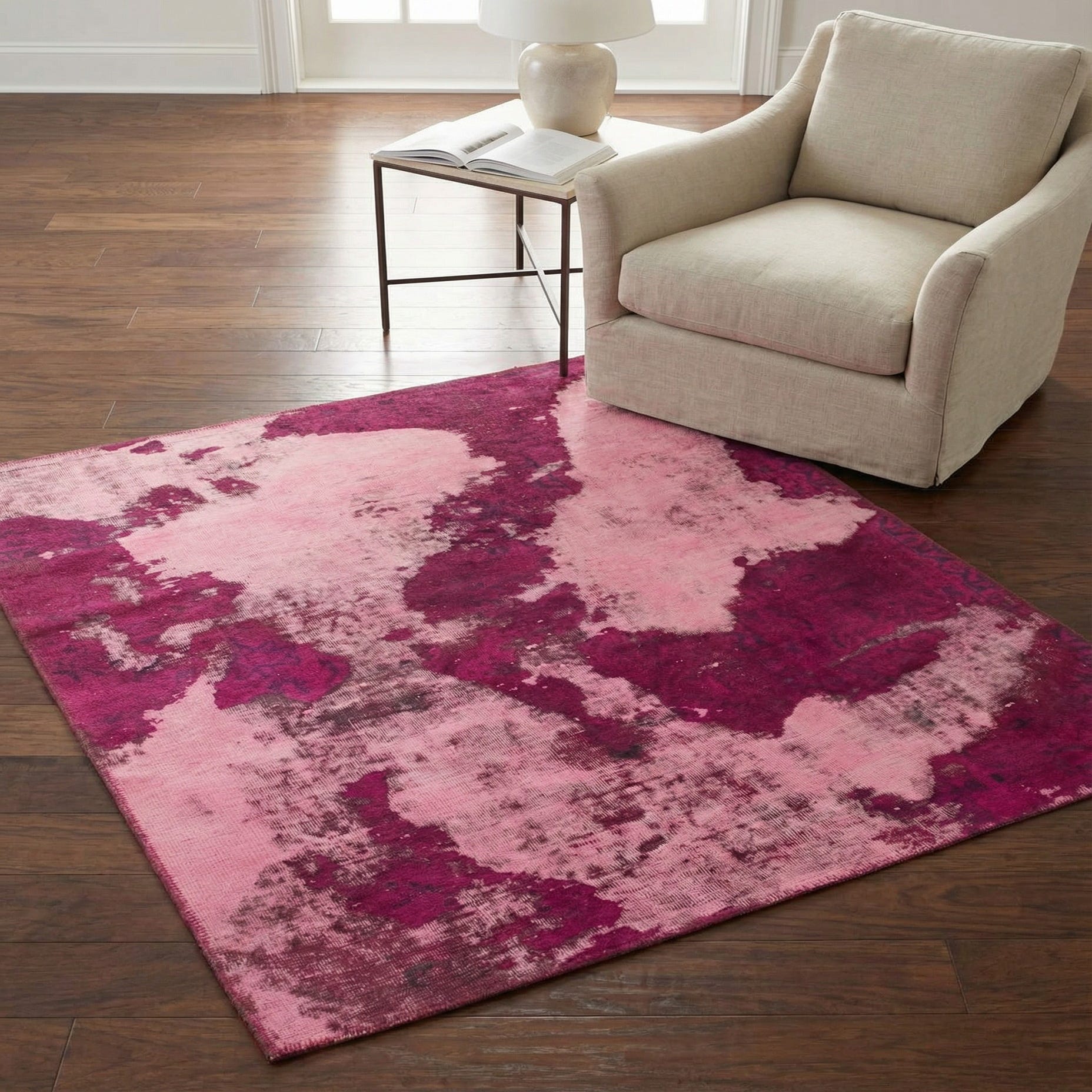 This color-forward piece works well as a focal anchor in a contemporary living room beneath a low-profile sofa and coffee table, or layered in a bedroom to add warmth at the foot of the bed. It also livens a home office or reading nook. Pair with neutral linens and natural wood tones to balance the pink and burgundy, or mix with jewel-toned accents and metal finishes for a modern, layered interior.