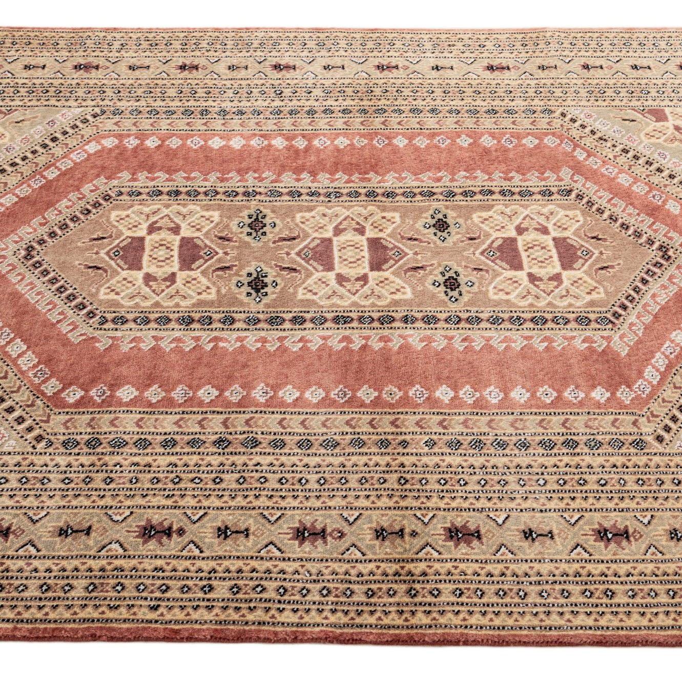 A 4x6 rectangular Bokhara rug featuring a central pink medallion with tribal patterns and intricate borders in pinks and beige.