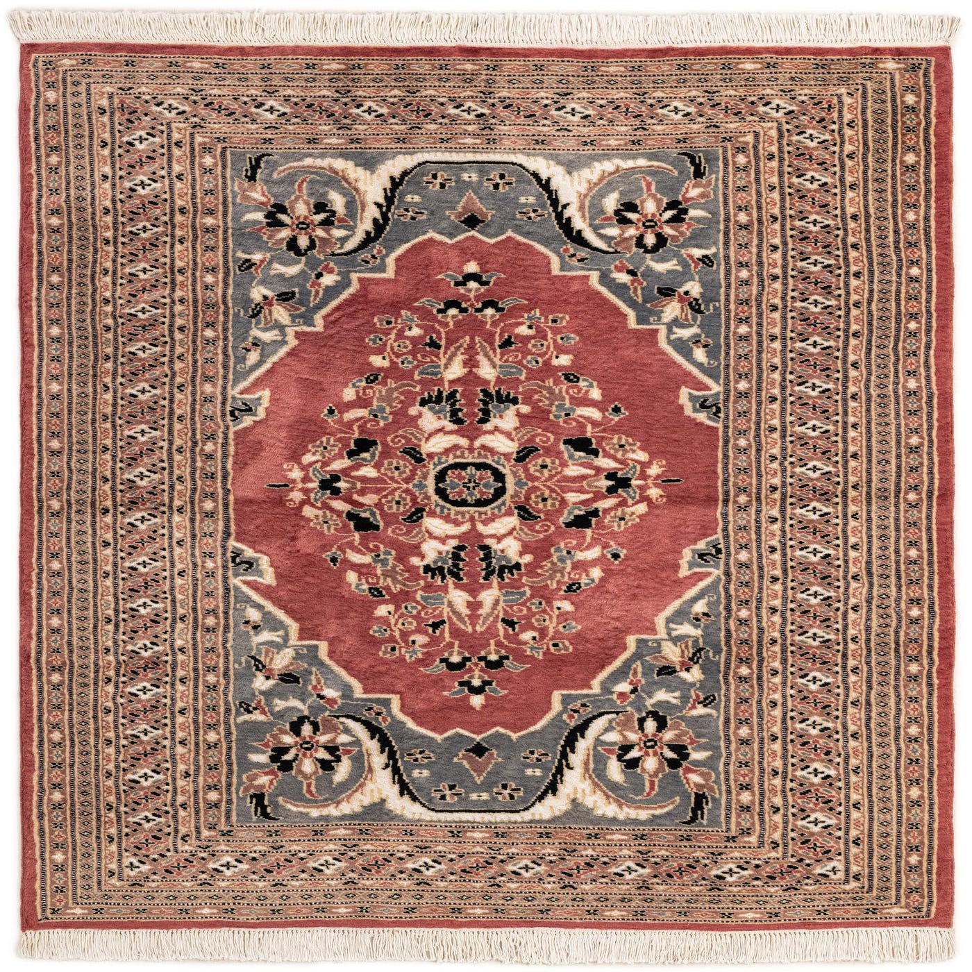 A 4x6 rectangular Bokhara rug featuring a central medallion and intricate tribal patterns in shades of pink, grey, and black with fringe.